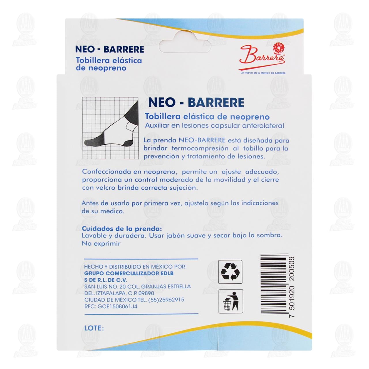 Tobillera Elástica Barrere, de neopreno unisex, con diseño ajustable, brinda soporte y termocompresión para prevenir y tratar lesiones en el tobillo. Contiene 1 pieza de talla mediana-grande.