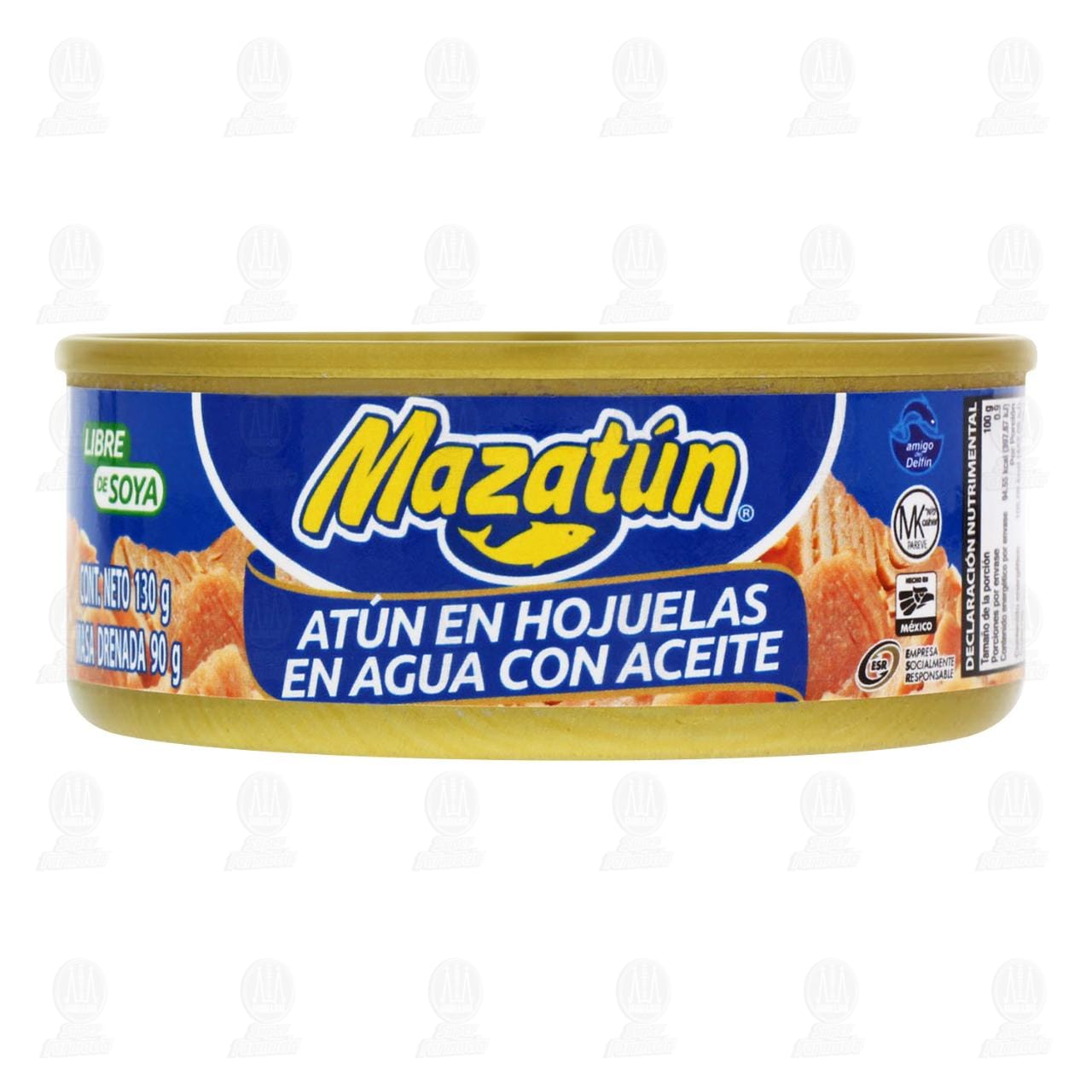 Alimento enlatado Mazatún, atún en hojuelas en agua con aceite, sin conservadores, libre de soya. Lata con 130 gramos, masa drenada 90 gramos.