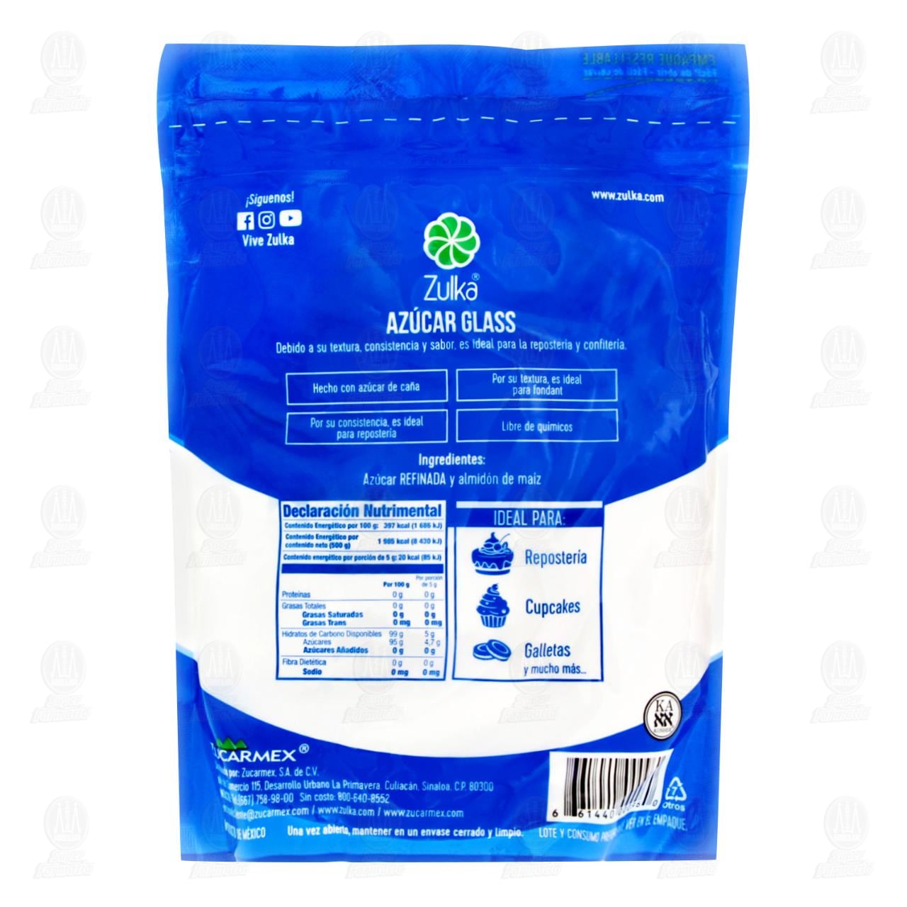 Azúcar Zulka Glass elaborada con azúcar de caña, ideal para repostería y confitería por su textura, consistencia y sabor. Contiene 500 gramos.