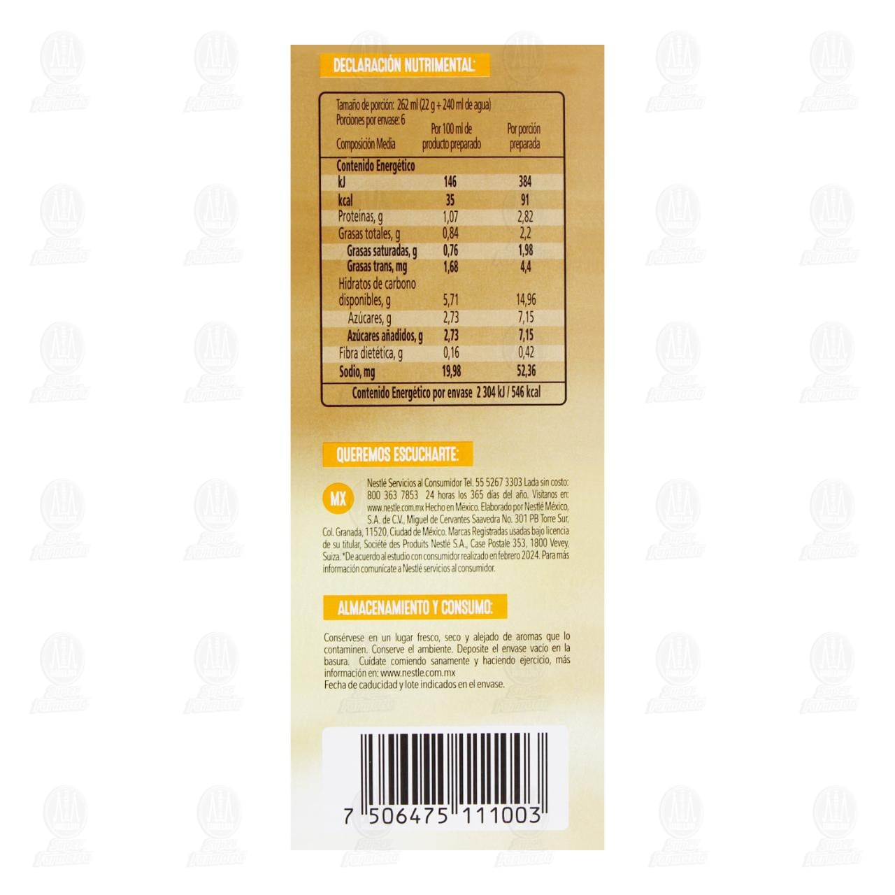 Exceso Calorías. Exceso Azúcares. Exceso Grasas Saturadas. Contiene edulcorantes, no recomendable en niños. Contiene leche. Puede contener soya. Consérvese en un lugar fresco, seco y alejado de aromas que lo contaminen.Detalles del producto