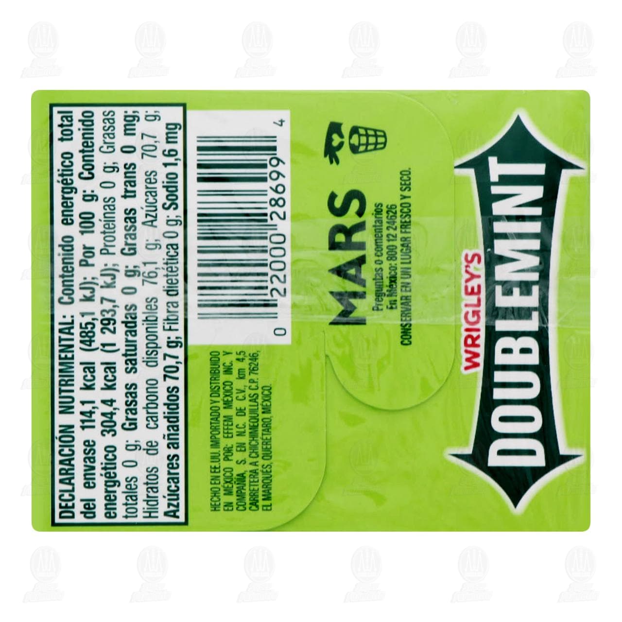 Chicles Wrigley's Doublemint, goma de mascar sabor menta. Paquete de 37.5 gramos con 15 piezas.