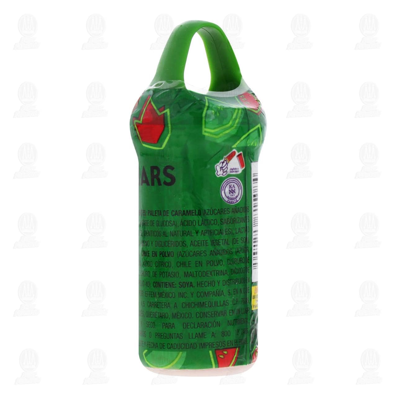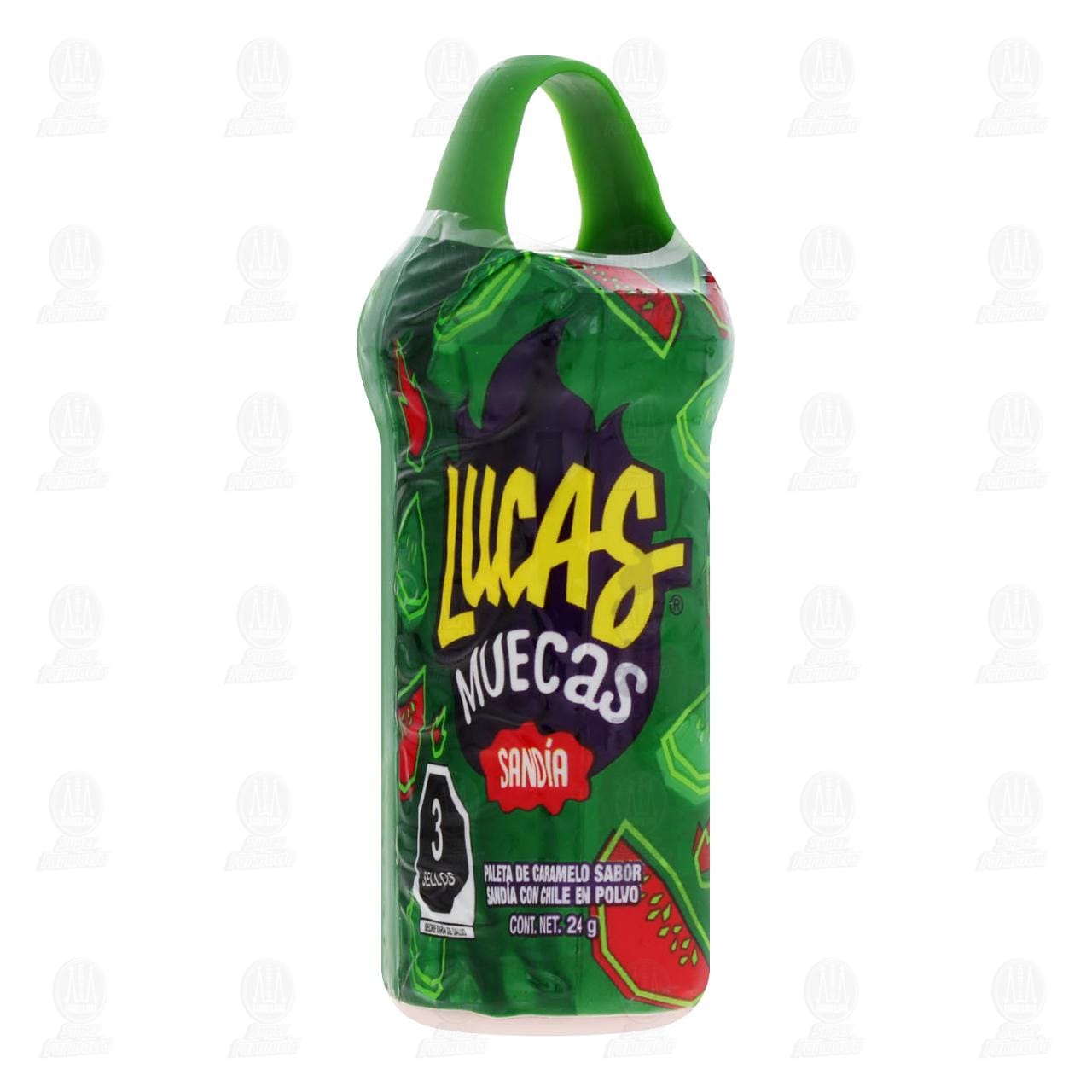 Paleta de caramelo Lucas Muecas, sabor sandía con chile en polvo. Contiene 24 gramos.