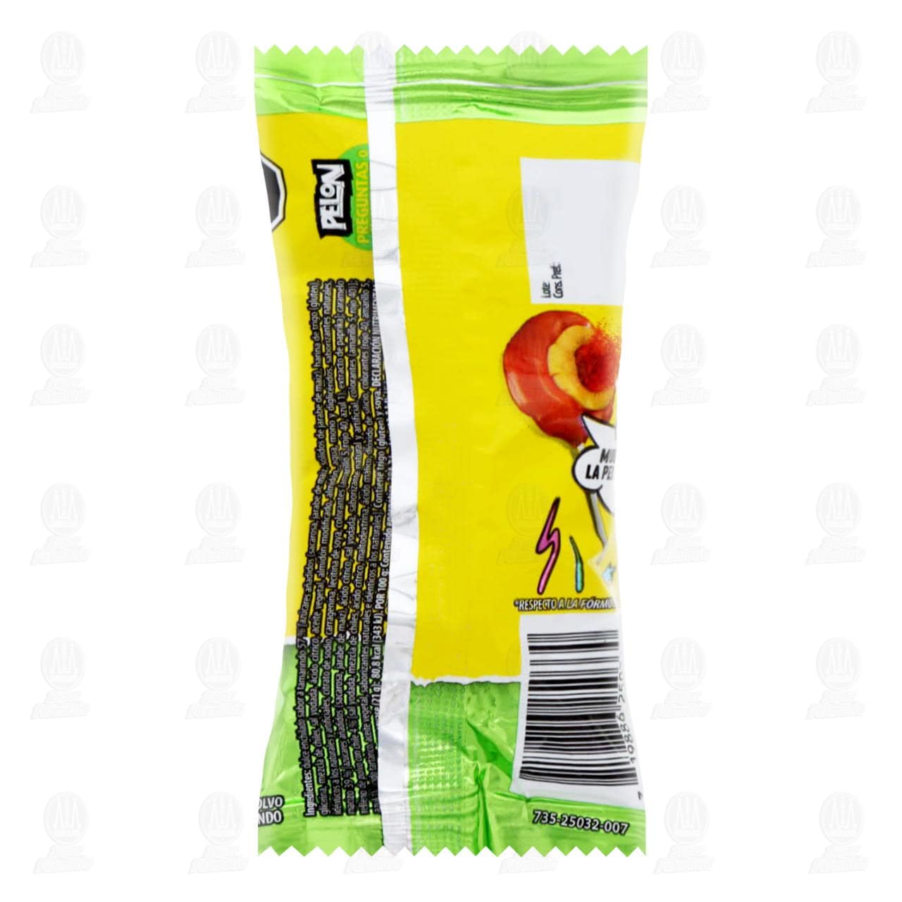 Dulce Pelon Peloneta, paleta de caramelo macizo sabor a mango, rellena de polvo con chile y cubierta de dulce enchilado sabor a tamarindo. Contiene 21 gramos.