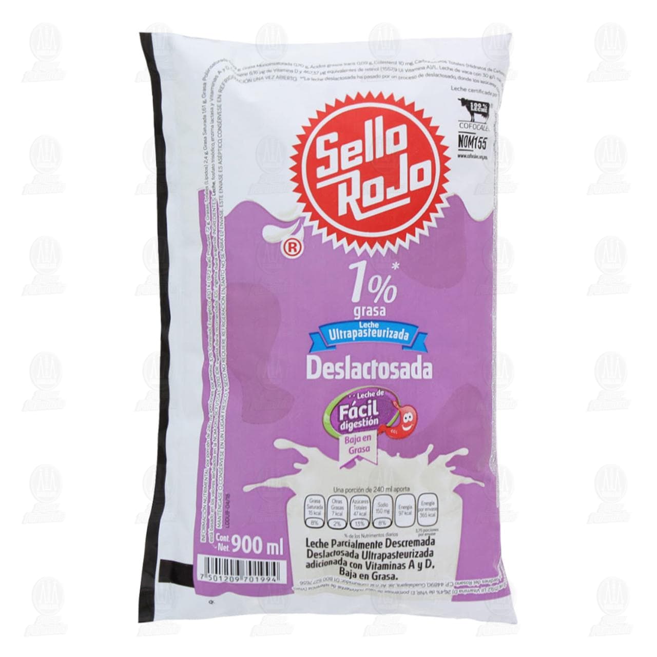 Leche Sello Rojo parcialmente descremada deslactosada ultrapasteurizada, adicionada con vitaminas A y D, con 1% grasa. Bolsa con 900 mililitros.