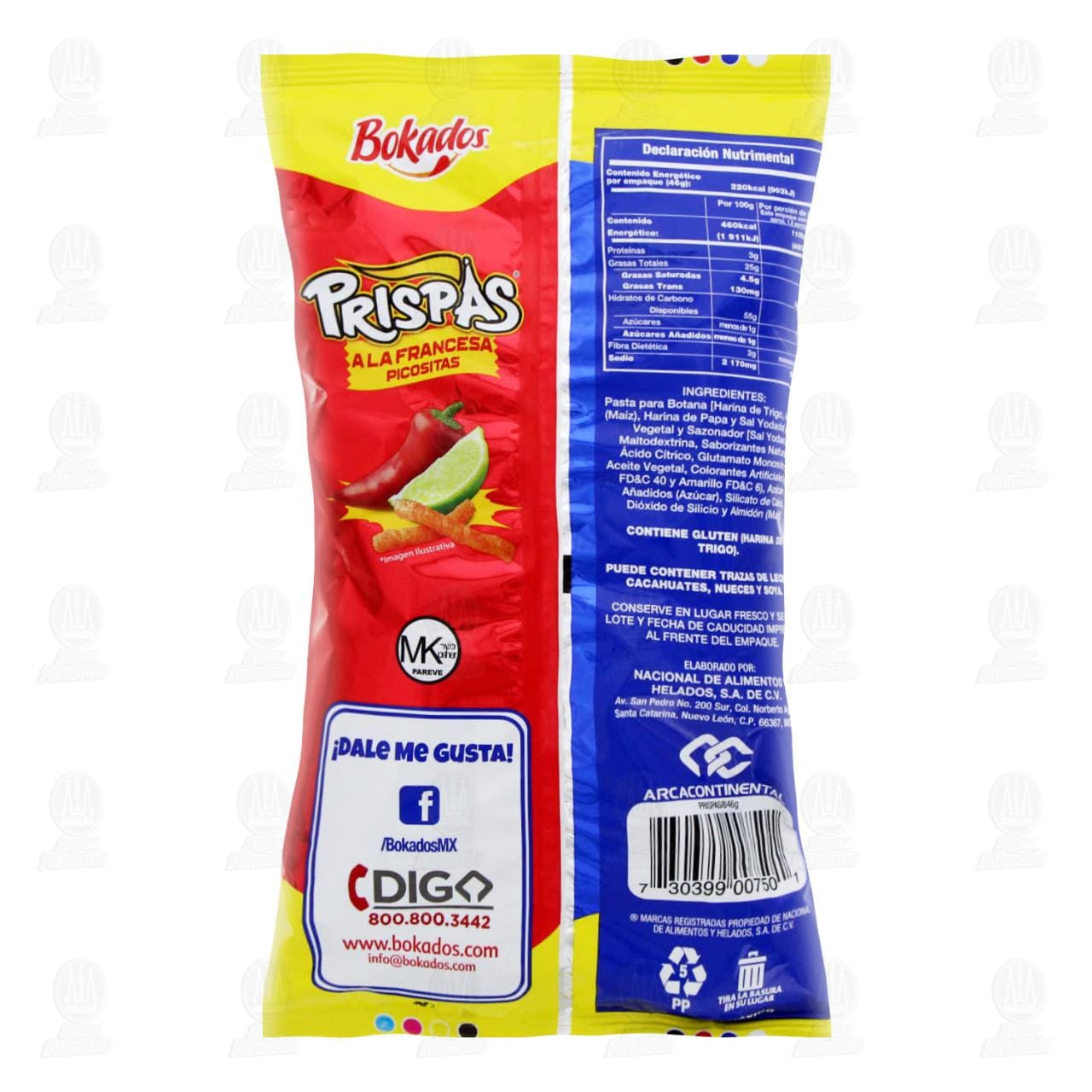 Botana Bokados Prispas a la francesa, elaborada a base de harina de trigo, sazonada, sabor chile y limón. Bolsa con 46 gramos.