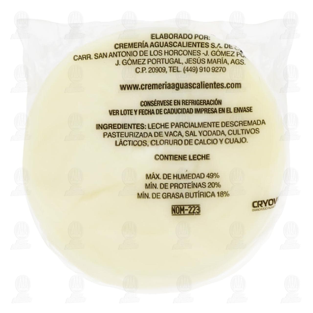 Queso asadero Aguascalientes, elaborado de leche parcialmente descremada pasteurizada de vaca. Contiene 200 gramos.