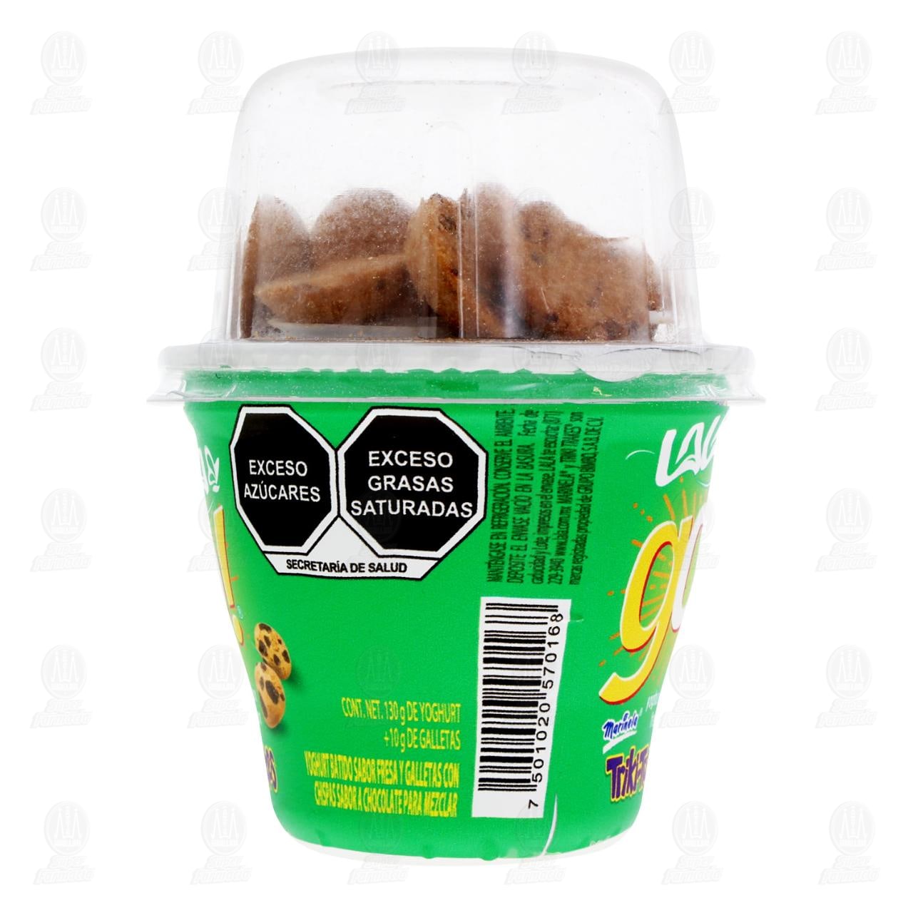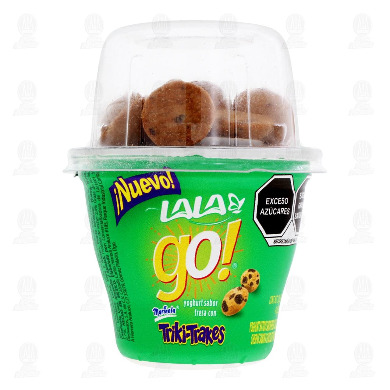 Yoghurt Lala Go Sabor Fresa y Galletas con Chispas Sabor a Chocolate (Triki-Trakes) para Mezclar. Contiene 130 gramos de Yoghurt y 10 gramos de Galletas.