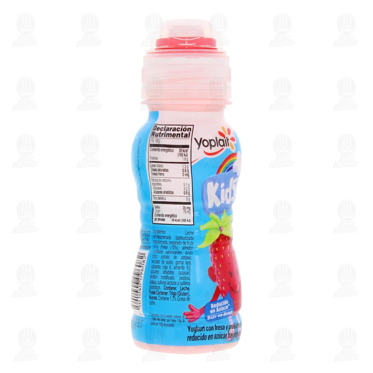 Yoghurt para beber Yoplait Kids con fresa y probióticos, reducido en azúcar, bajo en grasa y con tapa antiderrames. Envase con 100 gramos.