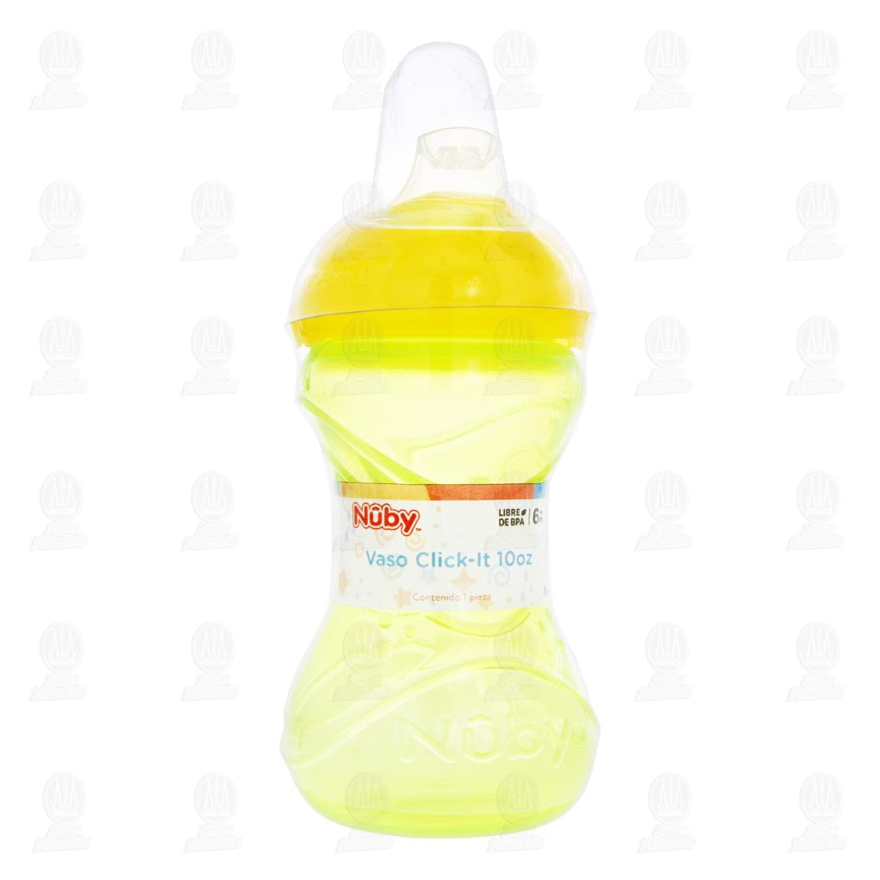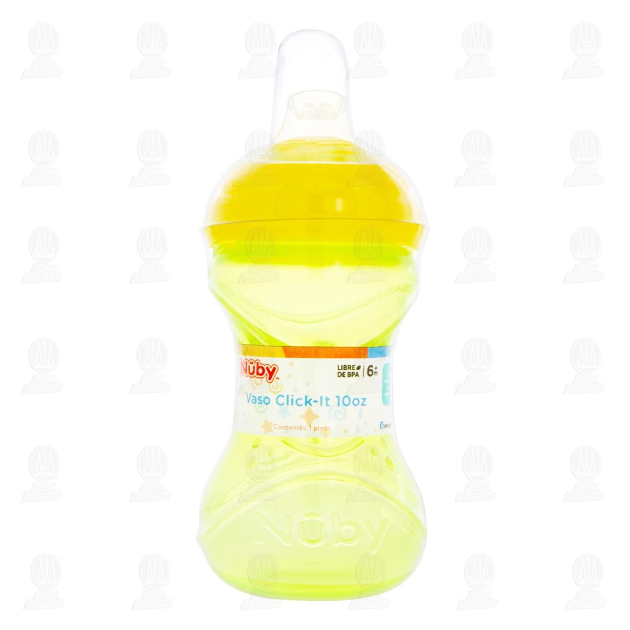Vaso Entrenador Nuby Click-It de varios colores con válvula Touch-Flo que regula la entrada de líquido, libre de BPA y recomendado para bebés mayores de 6 meses. Contiene 1 pieza con capacidad de 10 onzas.