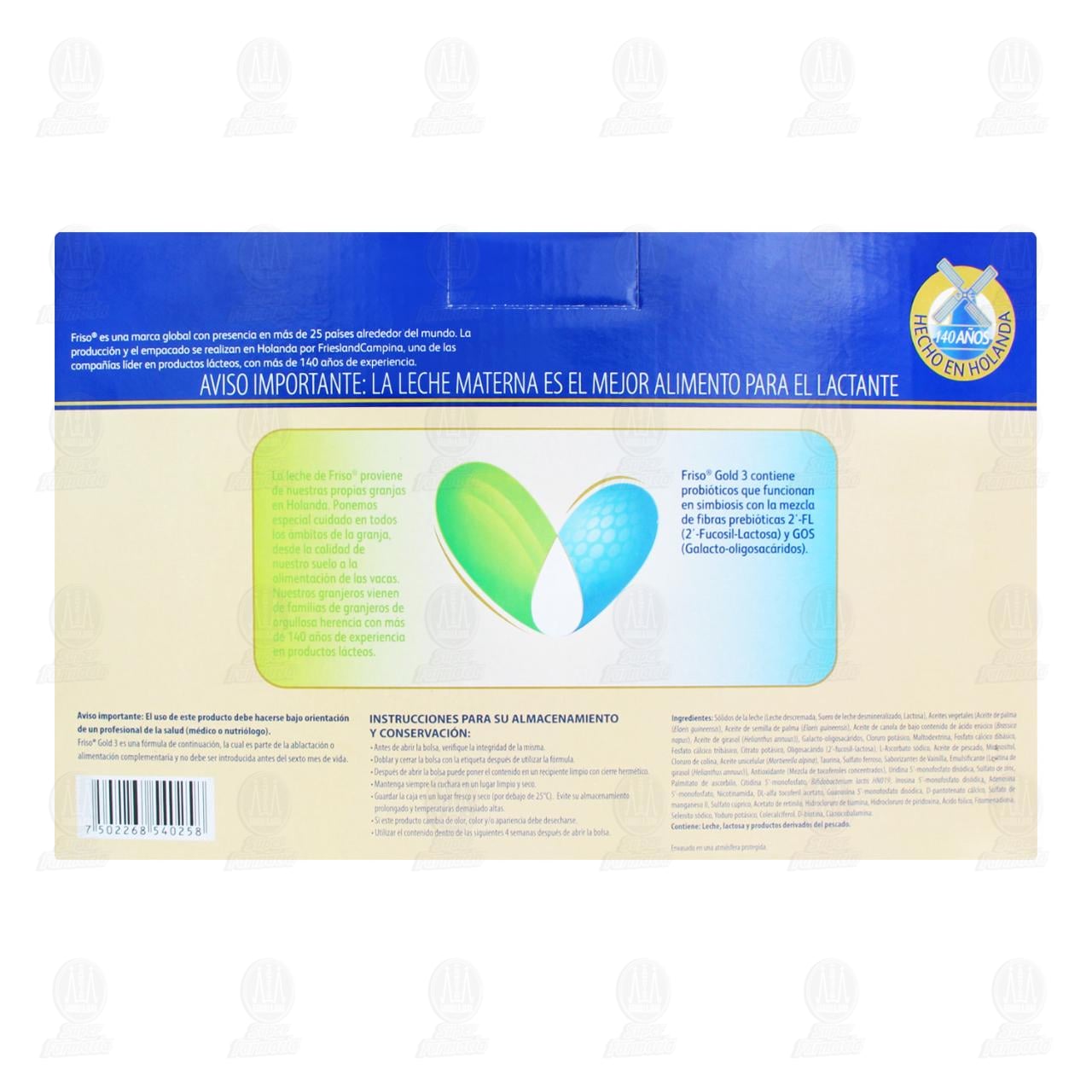 Fórmula Infantil de Continuación Friso Gold 3 sabor vainilla para niños de 1 a 3 años con probióticos 2 FL y GOS. Contiene 1.6 kilogramos (3 bolsas de 400 gramos y 1 lata de 400 gramos).