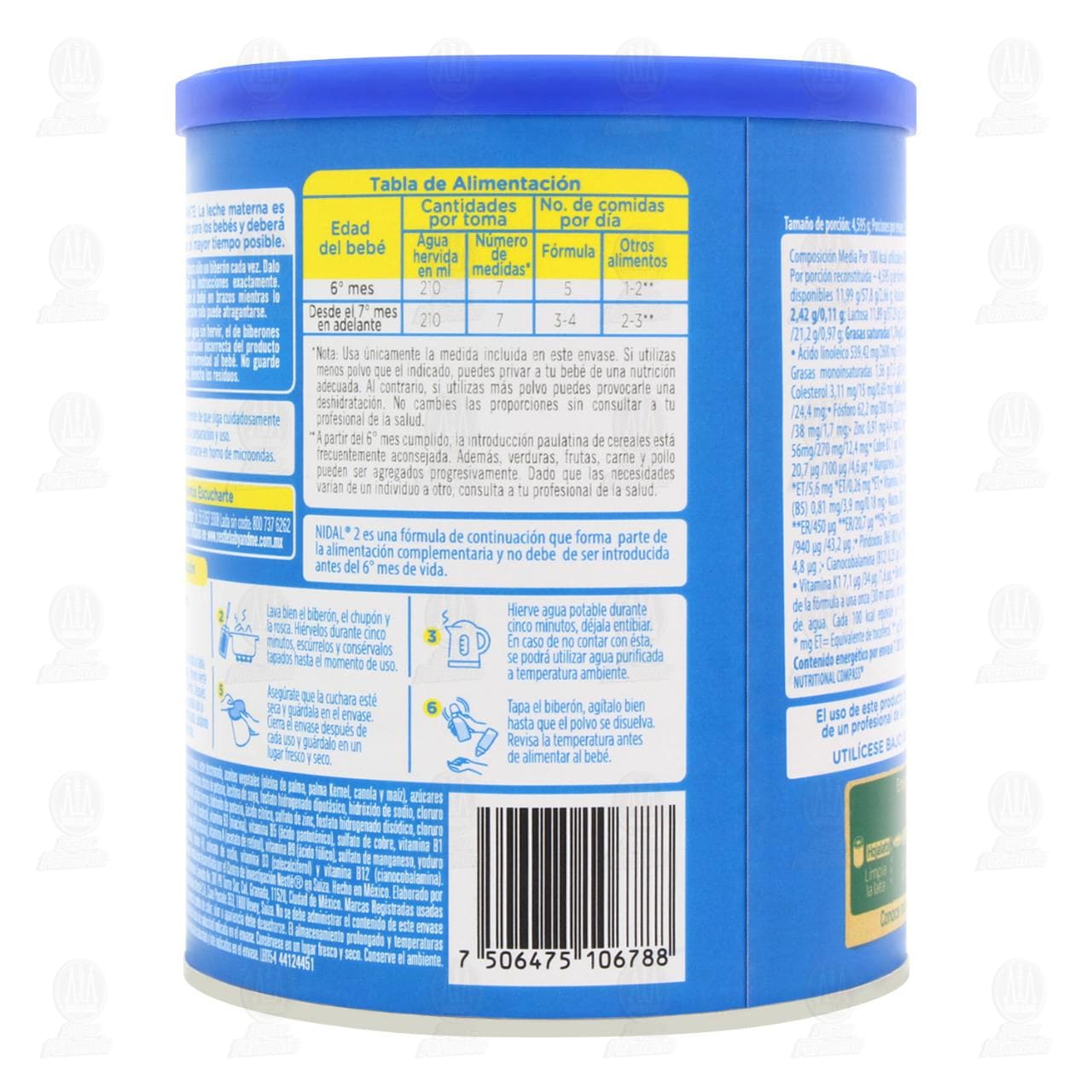 Prepara sólo un biberón cada vez. Dalo inmediatamente. Sigue las instrucciones exactamente. Recuerda tener siempre al bebé en brazos mientras lo alimentas. Un bebé que come solo puede atragantarse. El uso de agua sin hervir, el de biberones no hervidos o la reconstitución incorrecta del producto pueden ocasionar una enfermedad al bebé. No guarde biberones sin terminar, desecha los residuos. La leche materna es el mejor alimento para los bebés y deberá continuarse por el mayor tiempo posible. El uso de este producto debe hacerse bajo la orientación de un profesional de la salud (médico o nutriólogo). Nidal 2 es una fórmula de continuación que forma parte de la alimentación complementaria y no debe de ser introducida antes del 6° mes de vida.Detalles del producto