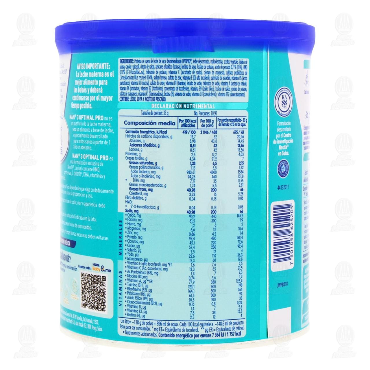 Contiene leche, soya y aceite de pescado. El uso de este producto debe hacerse bajo orientación de un profesional de la salud (médico o nutriólogo). Sigue las instrucciones exactamente. La salud de su hijo depende de que siga cuidadosamente las instrucciones para la preparación y uso. Si utilizas menos polvo que el indicado, puedes privar a tu bebé de una nutrición adecuada. Al contrario, si utilizas más polvo puedes provocarle una deshidratación. No cambies las proporciones sin consultar a tu profesional de la salud. El uso de agua sin hervir, el de vasos no hervidos o la reconstitución incorrecta del producto pueden ocasionar una enfermedad al niño. NAN 3 Optimal Pro no es un sustituto de la leche materna, sino un alimento a base de leche, especialmente desarrollado para niños sanos a partir de 1 año en adelante. Aviso importante: La leche materna es el mejor alimento para los bebés y deberá continuarse el mayor tiempo posible. La fórmula no debe calentarse en horno de microondas. Consérvese en un lugar fresco y seco. Para mantener el número de cultivos probióticos vivos, el agua hervida se debe enfriar a la temperatura del cuerpo antes de agregar el polvo. No se debe administrar el contenido de esta lata un mes después de abierta. El almacenamiento prolongado y temperaturas excesivas deben evitarse. Si este producto cambia de color, olor o apariencia debe desecharse. Úsala antes de la fecha de caducidad indicada en la lata.Detalles del producto
