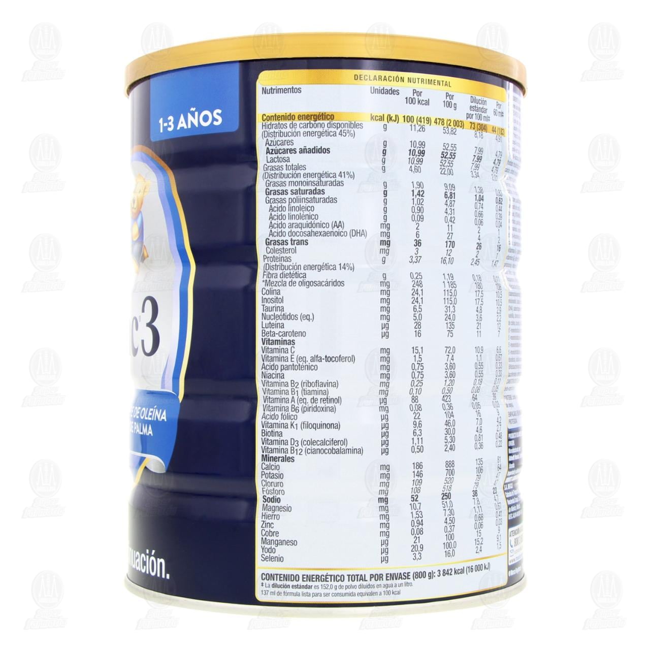 Aviso importante: La leche materna es el mejor alimento para el lactante y se recomienda su uso por el mayor tiempo posible durante la infancia. El uso de Similac 3 debe hacerse bajo orientación de un profesional de la salud (médico o nutriólogo). Las fórmulas de continuación son parte de la alimentación complementaria y no deben ser introducidas antes del sexto mes de vida. No se use en casos de galactosemia. La salud de su hijo depende de que siga cuidadosamente las instrucciones de preparación y uso. Almacenamiento: Conserve la lata cerrada a temperatura ambiente. Una vez abierta la lata, el contenido debe consumirse dentro de las tres semanas siguientes. Cubra la lata y guárdela en un lugar fresco y seco (no refrigerar). El almacenamiento prolongado y temperaturas excesivas deben evitarse. Advertencia: Nunca use un horno de microondas para preparar o calentar la fórmula. Ello puede resultar en quemaduras graves. Preparar la fórmula con agua a una temperatura mayor a 35°C puede reducir los beneficios de los probióticos.Detalles del producto