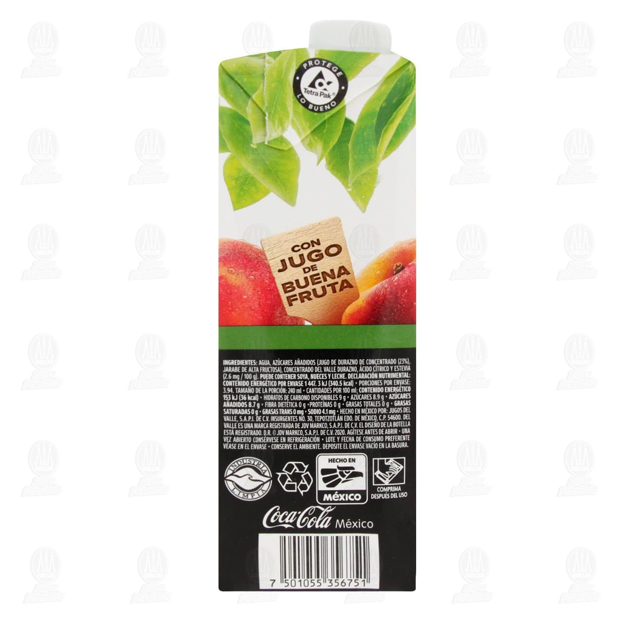 Néctar del Valle de durazno, con jugo de buena fruta. Envase con 946 mililitros.