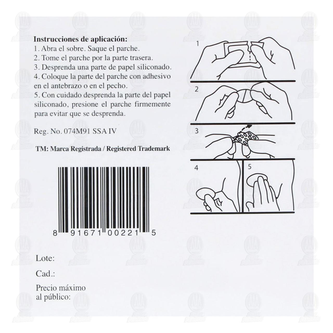Antes de su uso, se retira una tira protectora de la superficie adherente. Luego de su uso, el parche debe descartarse, de manera de evitar la aplicación accidental o la ingestión por parte de niños u otros.