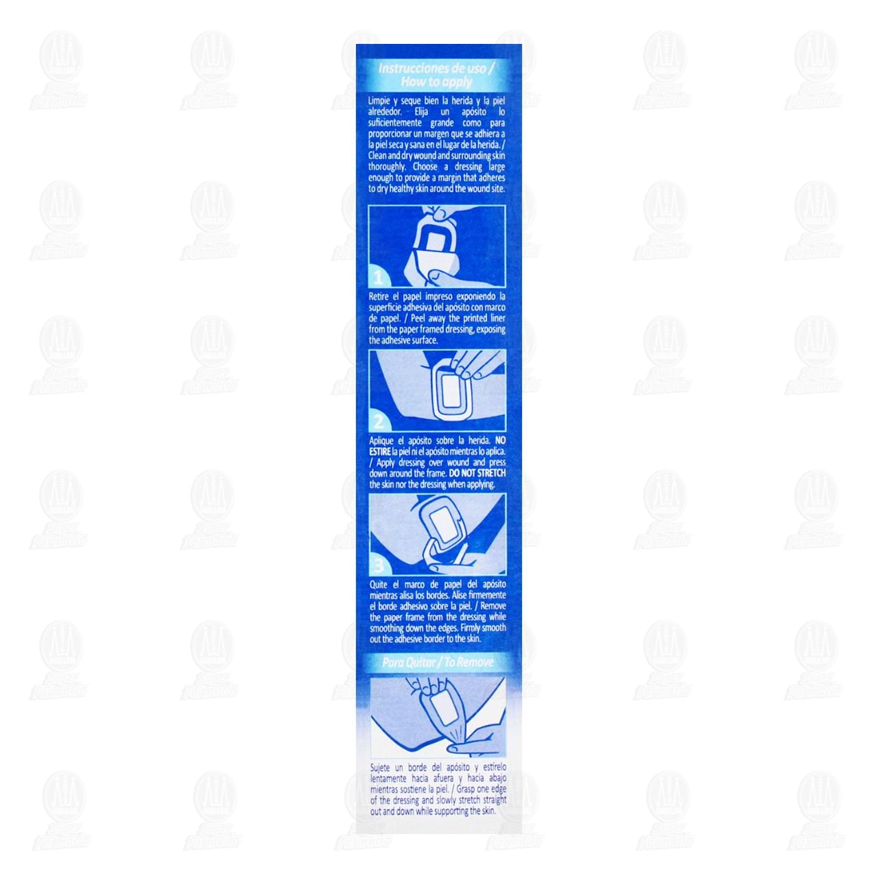 Limpie y seque bien la herida y la piel alrededor. Elija un apósito lo suficientemente grande como para proporcionar un margen que se adhiera a la piel seca y sana en el lugar de la herida. 1. Retire el papel impreso exponiendo la superficie adhesiva del apósito con marco de papel. 2. Aplique el apósito sobre la herida. no estire la piel ni el apósito mientras lo aplica. 3. Quite el marco de papel del apósito mientras alisa los bordes. Alise firmemente el borde adhesivo sobre la piel. Para quitar: Sujete un borde del apósito y estírelo lentamente hacia afuera y hacia abajo mientras sostiene la piel.Advertencias