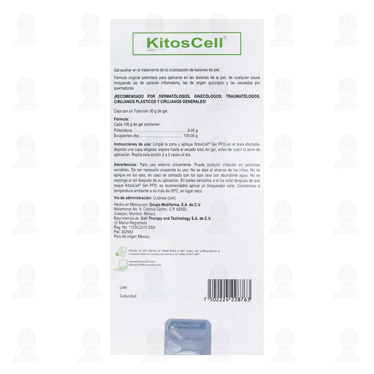 Vía de administración: cutánea (piel). Limpie la zona y aplique kitoscell gel en el área afectada, dejando una capa delgada, espere hasta el secado total del gel, antes de cubrir la zona de aplicación. Repita esta acción 2 a 3 veces al día.Detalles del producto