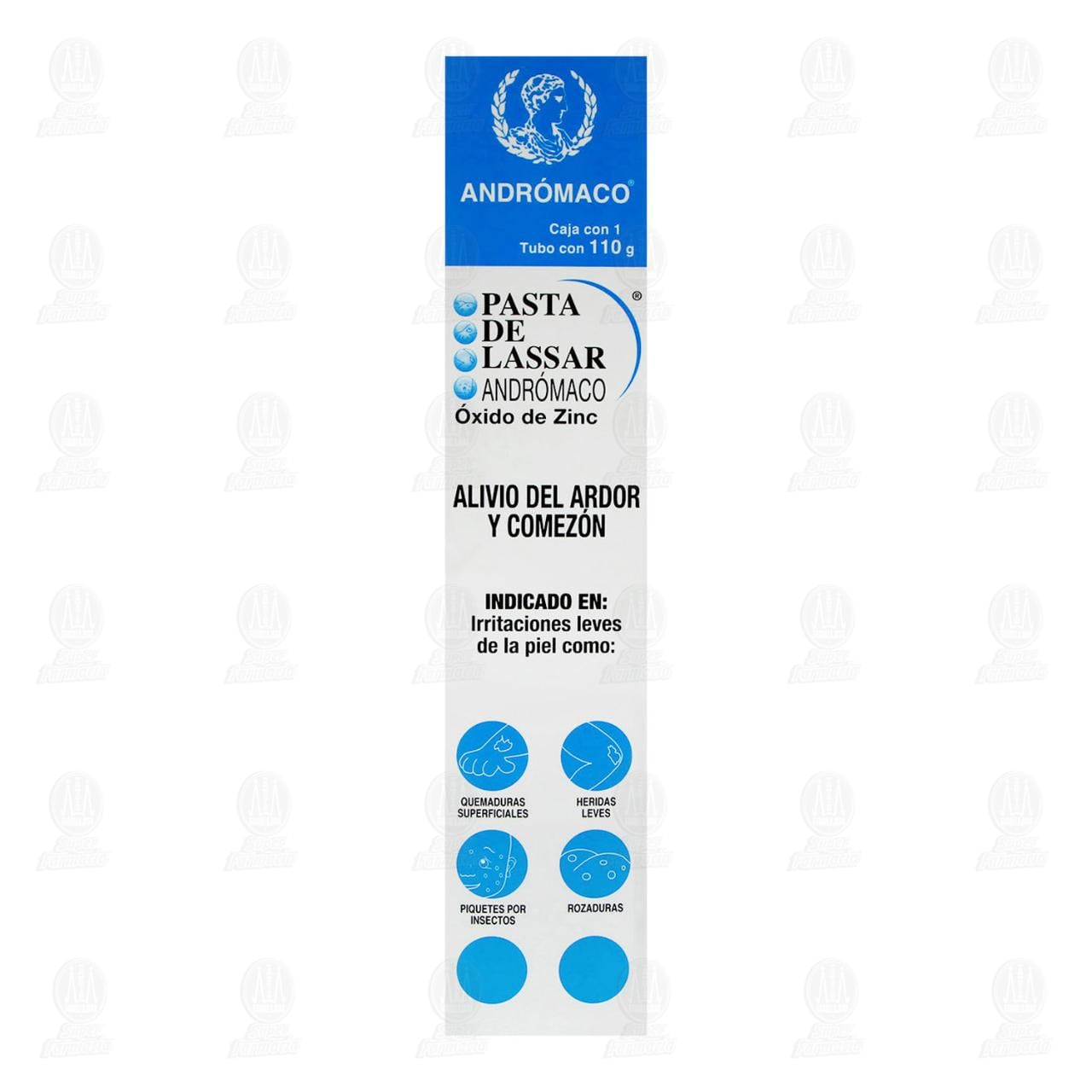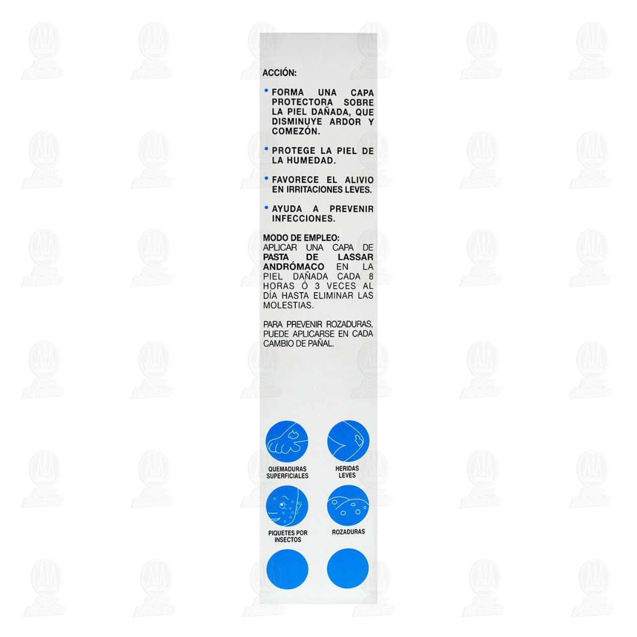 INDICACIONES DE USO: PASTA DE LASSAR ANDRÓMACO está indicado para irritaciones leves de la piel como quemaduras superficiales, heridas leves, comezón por piquetes de insectos y rozaduras.