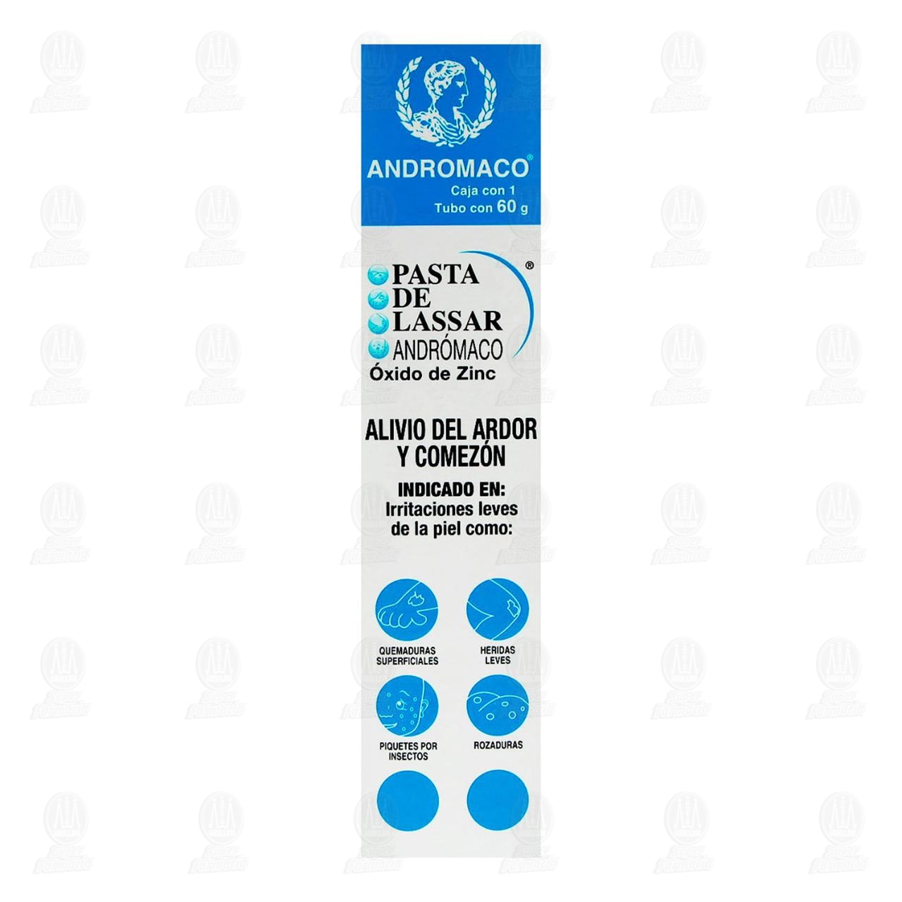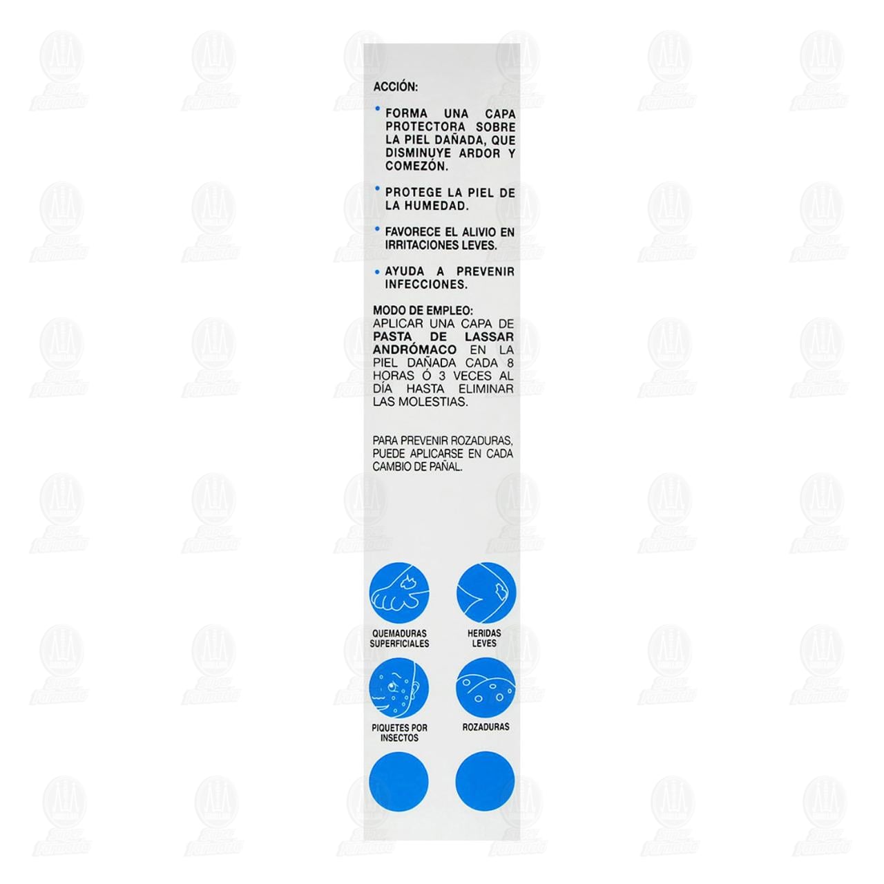 INDICACIONES DE USO: PASTA DE LASSAR ANDRÓMACO está indicado para irritaciones leves de la piel como quemaduras superficiales, heridas leves, comezón por piquetes de insectos y rozaduras.