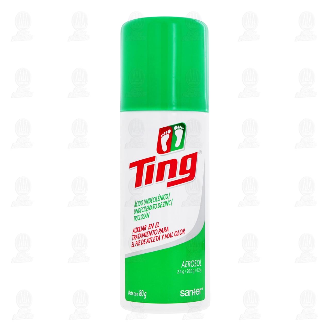 Ting Polvo en aerosol, auxiliar en el tratamiento para el pie de atleta y mal olor. Contiene 80 gramos (Ácido undecilénico, Úndecilenato de zinc, Triclosán)