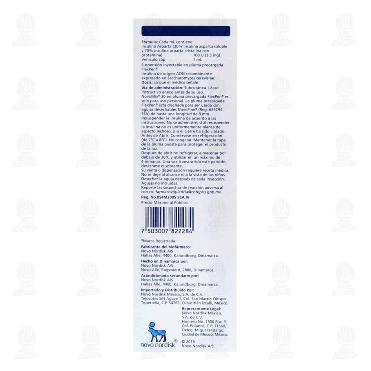 Su venta requiere receta médica. No se deje al alcance y la vista de los niños. Literatura exclusiva para médicos. NOVOMIX® 30 no debe usarse si el líquido resuspendido no tiene aspecto uniformemente blanco y opaco. Debe recalcarse al paciente la necesidad de resuspender la suspensión de NOVOMIX® 30 pluma precargada FlexPen® inmediatamente antes de usarse. No se debe usar NOVOMIX® 30 que haya sido congelado. Se debe recomendar al paciente desechar la aguja después de cada inyección. Las agujas no deben compartirse. El cartucho no debe volverse a llenar.