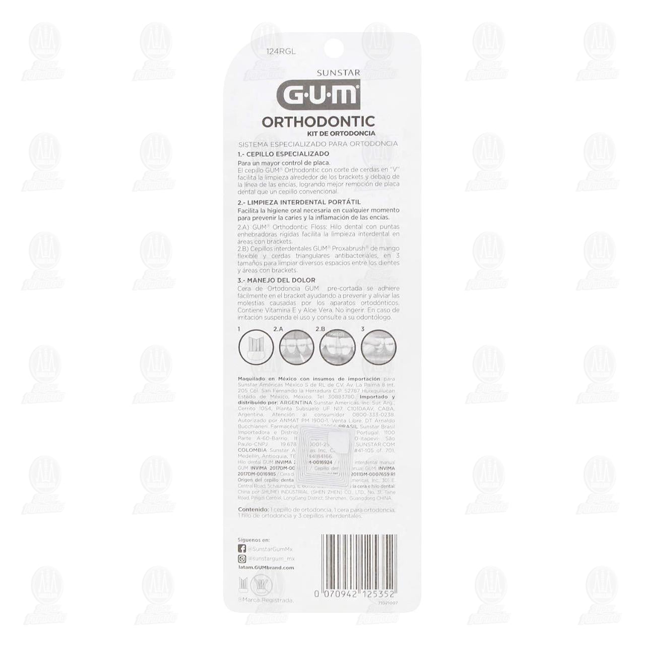 Kit de ortodoncia Gum Sunstar Orthodontic, sistema especializado que incluye las herramientas necesarias para limpiar fácil y eficazmente los dientes. Contiene 6 piezas (1 cepillo dental + 1 cera + 3 cepillos interdentales + 1 hilo dental).