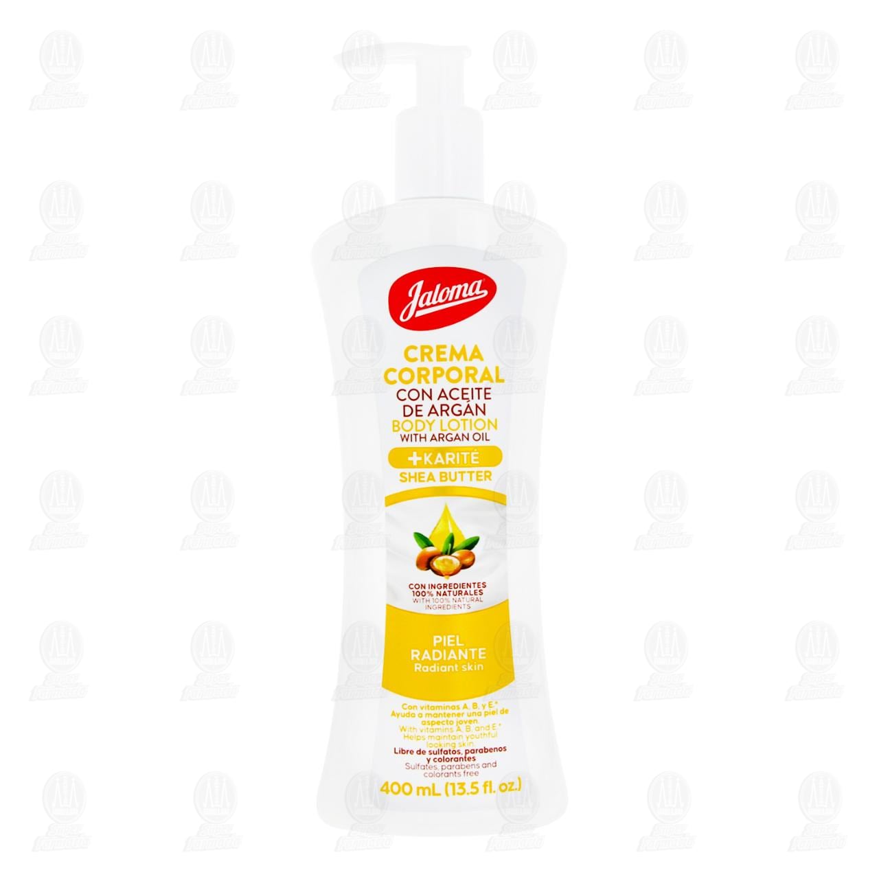 Crema Corporal Jaloma con Aceite de Argán + Karité, ayuda a mantener una piel de aspecto joven y radiante con vitaminas A, B y E. Contiene 400 mililitros.