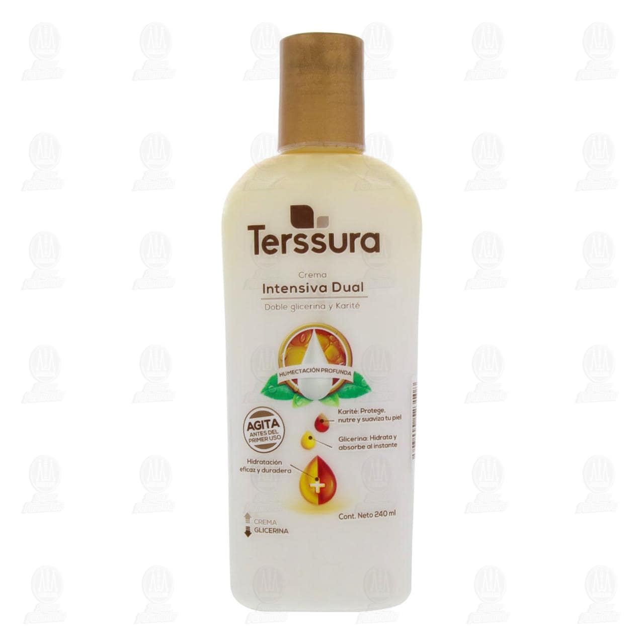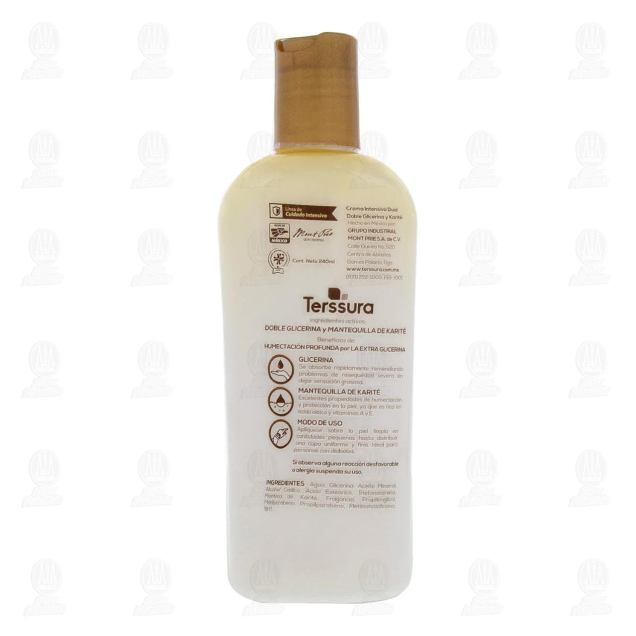 Crema corporal Terssura Intensiva Dual, con doble glicerina y karité para humectación profunda, ideal para personas con diabetes, hidratación eficaz y duradera. Envase con 240 mililitros.