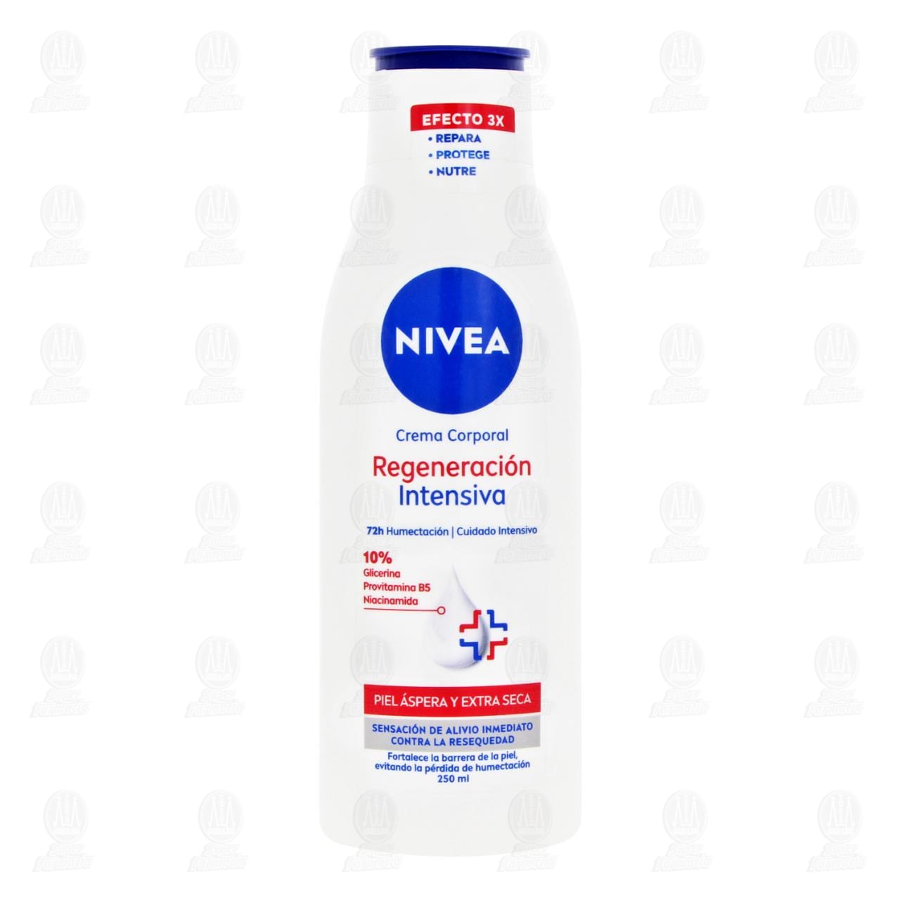 Nivea Crema Corporal Regeneración Intensiva para piel áspera y extra seca, Sensación de alivio inmediato contra la resequedad que fortalece la barrera de la piel evitando la pérdida de humectación. Envase con 250 mililitros.