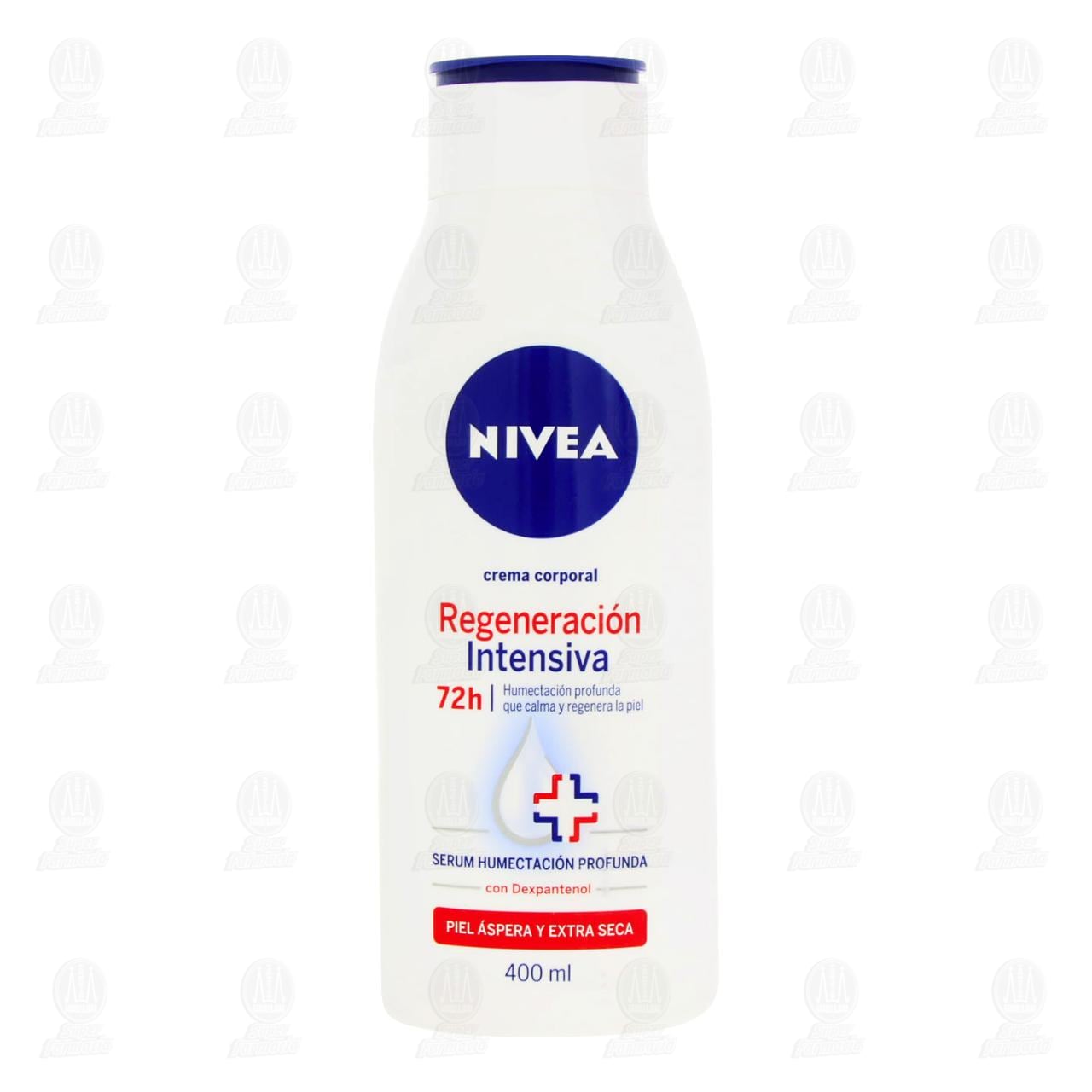 Crema corporal Nivea Regeneración Intensiva para piel áspera y extra seca, enriquecida con Serum Humectación Profunda y dexpantenol que ayuda a fortalecer la barrera de la piel evitando la pérdida de humectación. Envase con 400 mililitros.