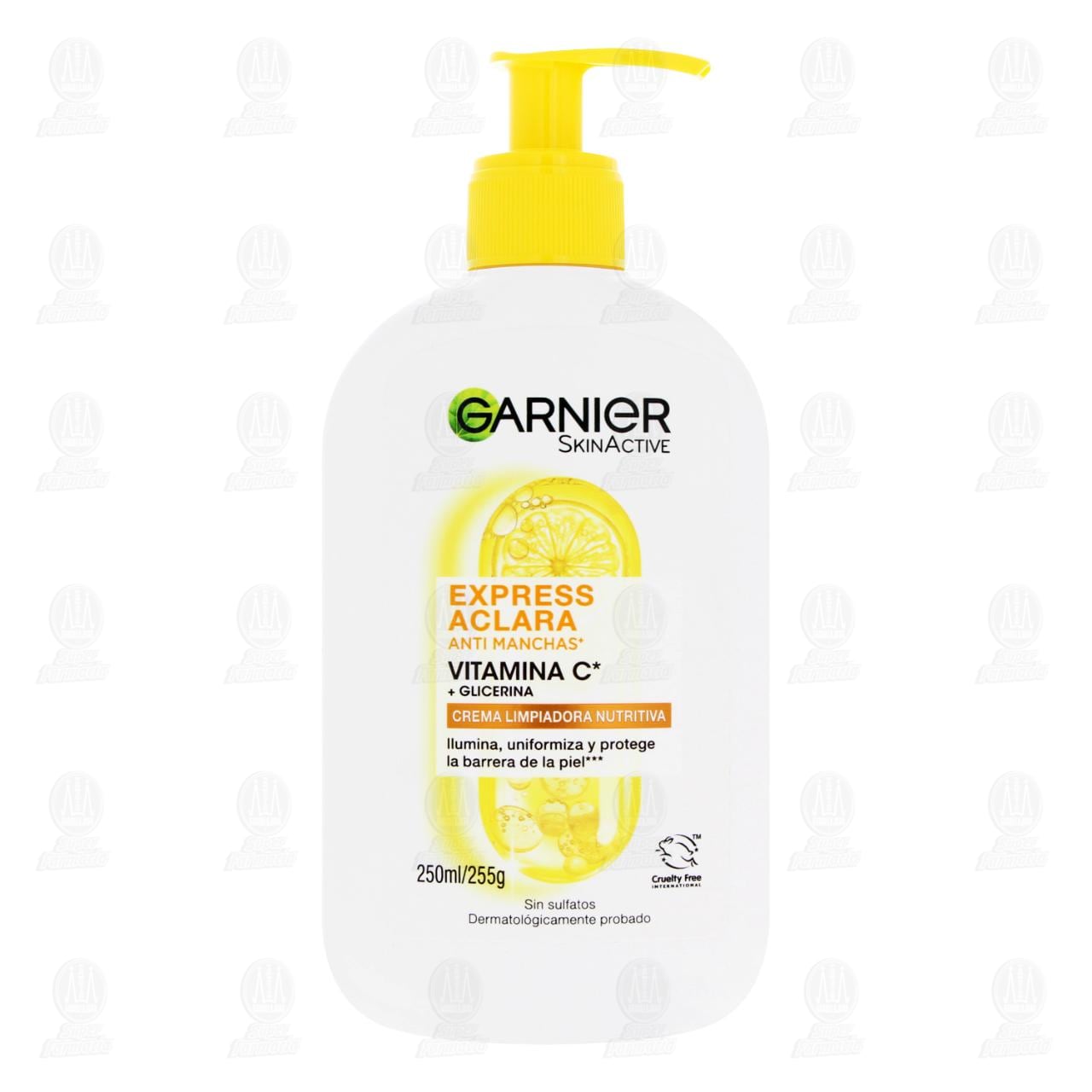 Crema Limpiadora Nutritiva Garnier SkinActive Express Aclara Anti Manchas con Vitamina C y Glicerina que ilumina, uniformiza y protege la barrera de la piel. Contiene 250 mililitros.
