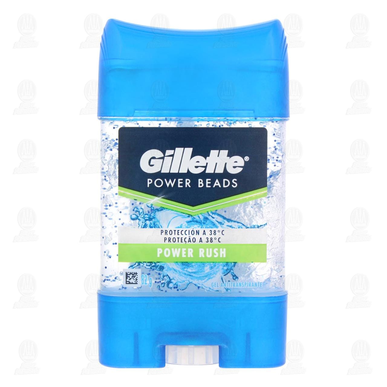 Antitranspirante Gillette Power Beads Power Rush en gel, protección a 38°C. Envase con 82 gramos.