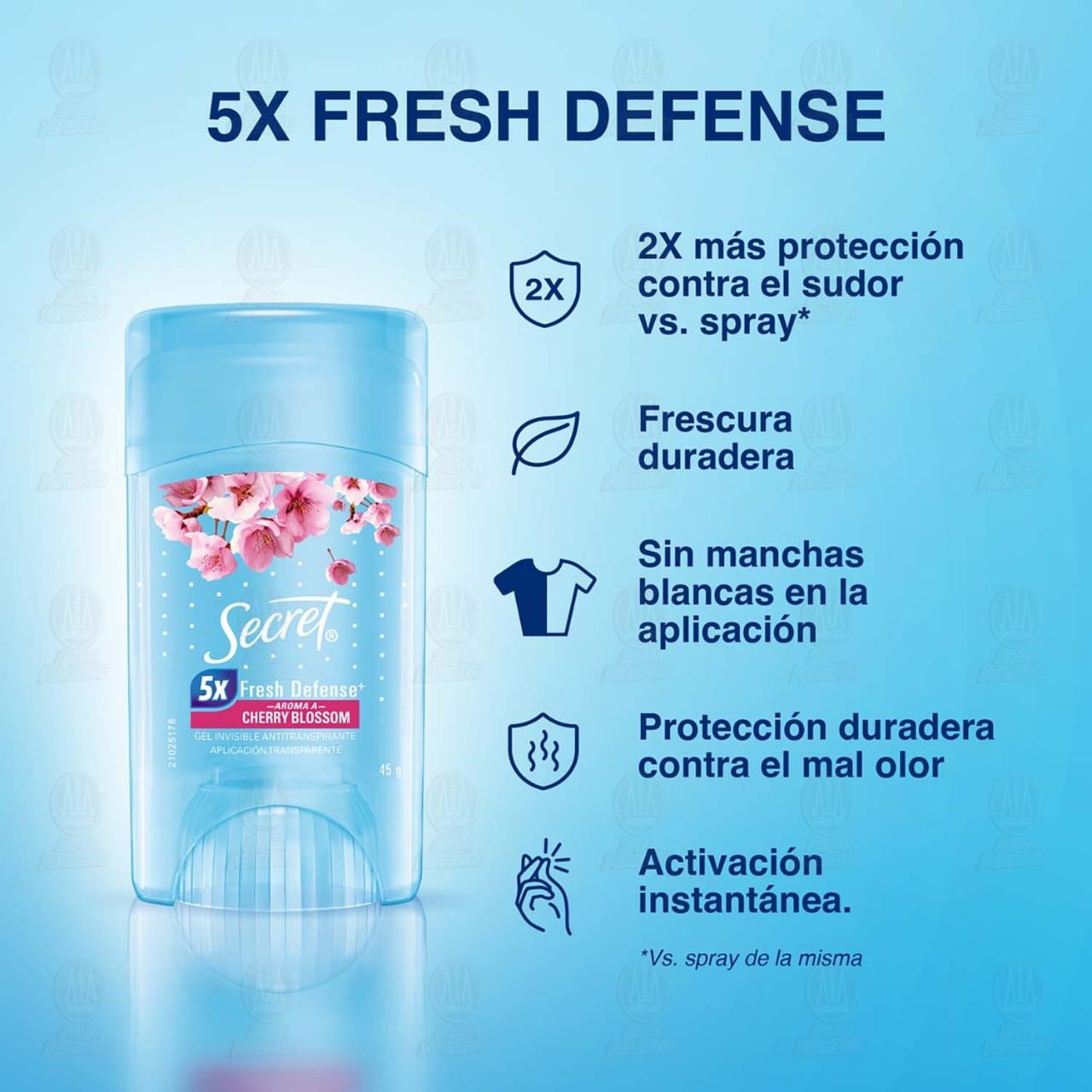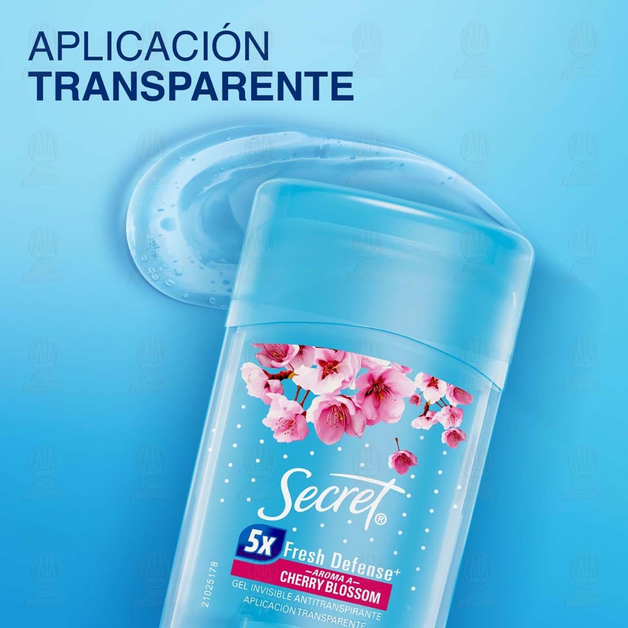 Antitranspirante invisible Secret Fresh Defense 5x aroma a cherry blossom en gel, Aplicación transparente con frescura duradera. Envase con 45 gramos.