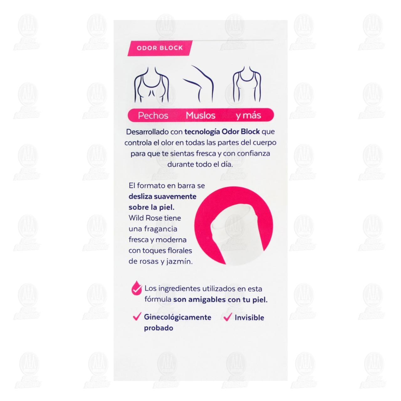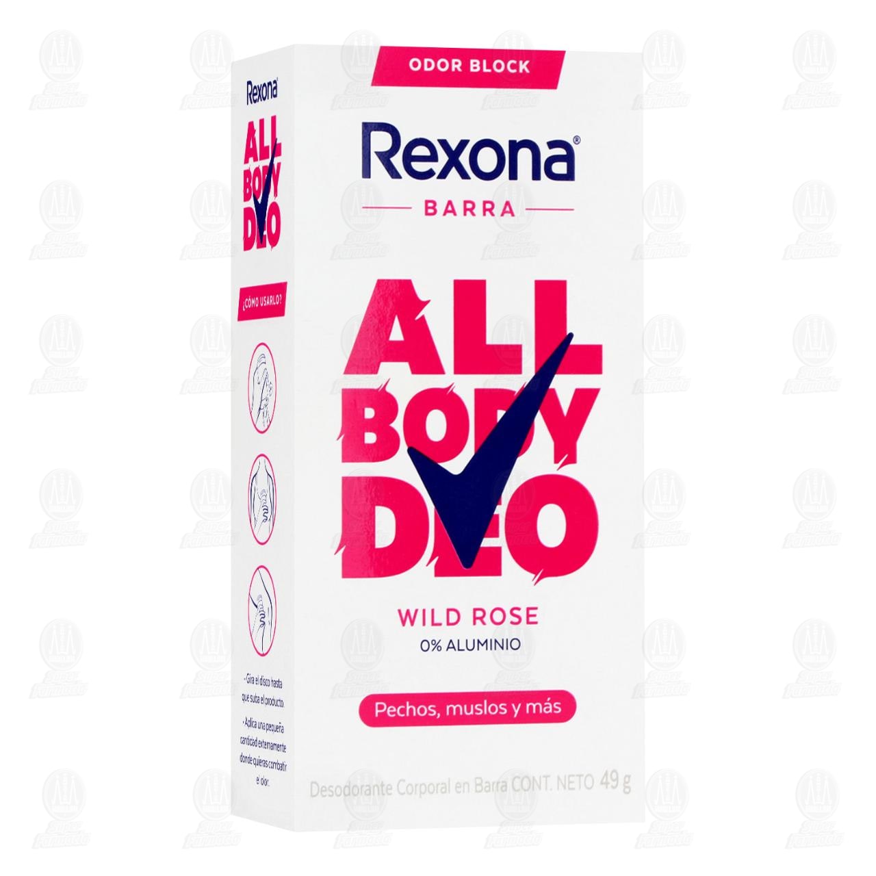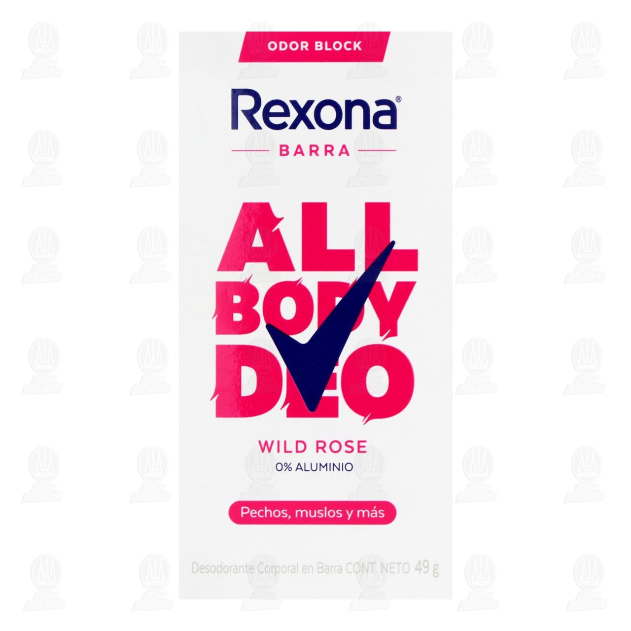 Desodorante corporal Rexona All Body Deo Wild Rose en barra con tecnología Odor Block, 0% aluminio y fórmula para pechos, muslos y otras zonas. Contiene 49 gramos.
