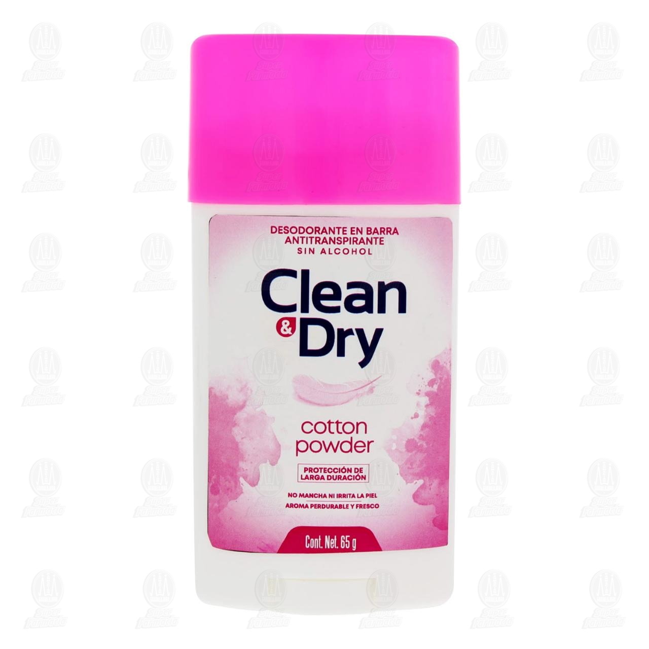 Desodorante en Barra Sin Alcohol Clean & Dry Cotton Powder, protección de larga duración, no mancha ni irrita la piel, aroma perdurable y fresco. Envase con 65 gramos.