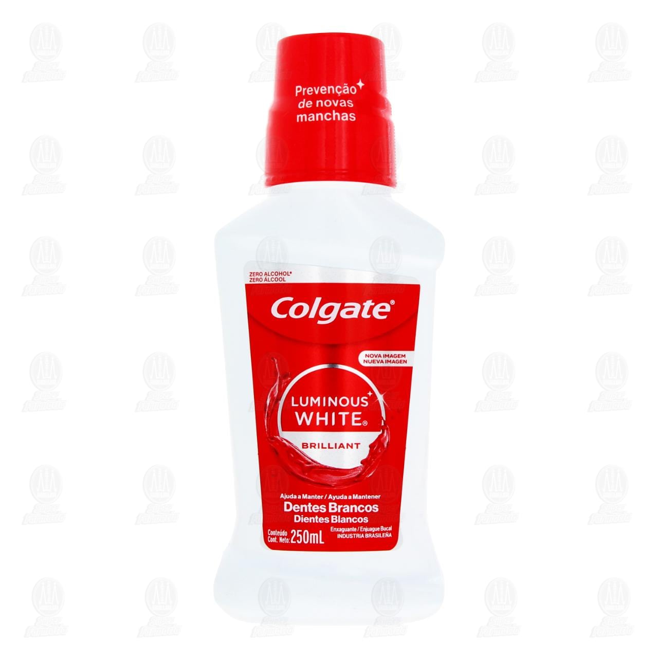 Enjuague Bucal Colgate Luminous White Brilliant que ayuda a mantener los dientes blancos, fórmula zero alcohol para uso diario. Contiene 250 mililitros.