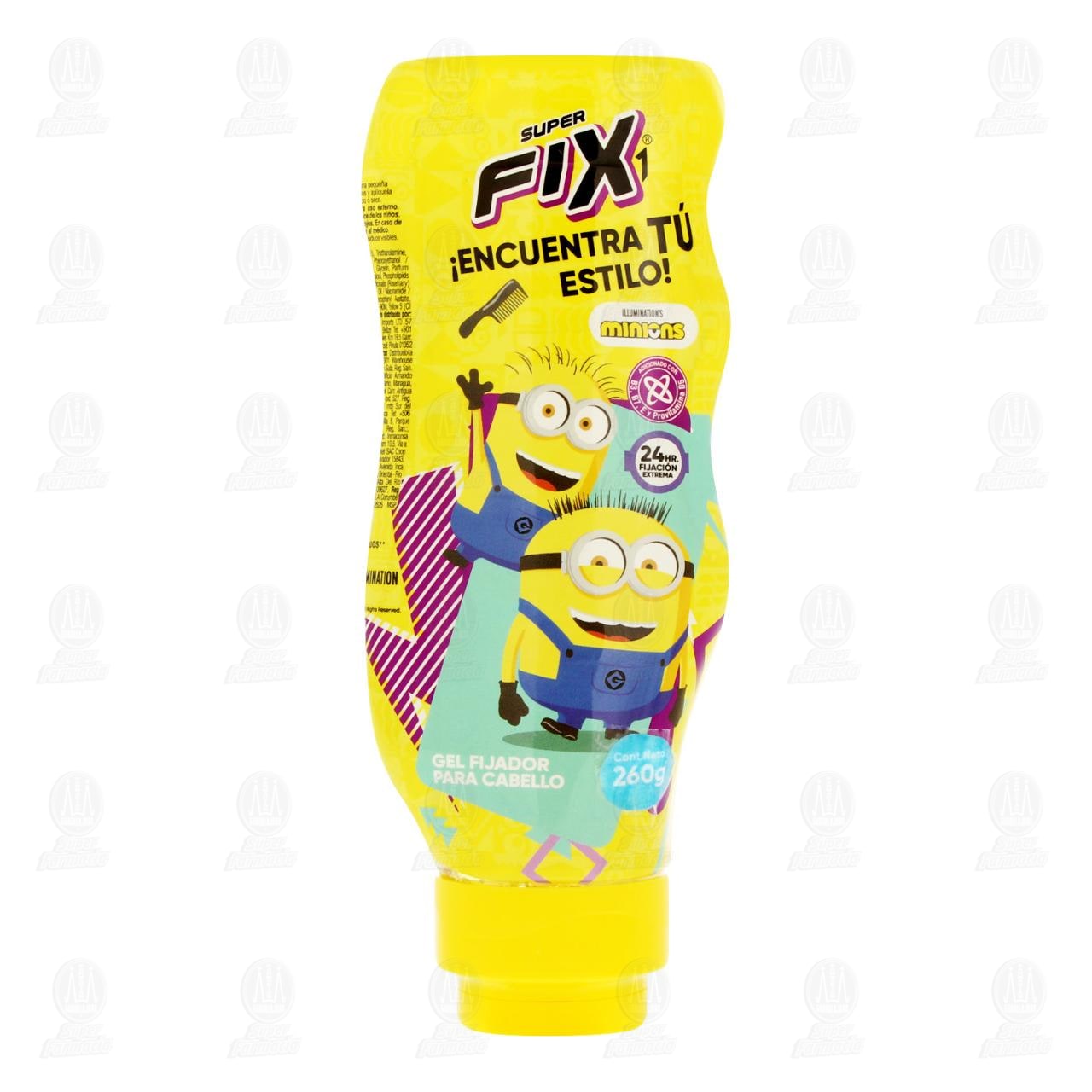 Gel Fijador Super Fix Minions para Cabello con fijación extrema por 24 horas, fórmula adicionada con vitamina B3, B1, E y provitamina B5. Contiene 260 gramos.
