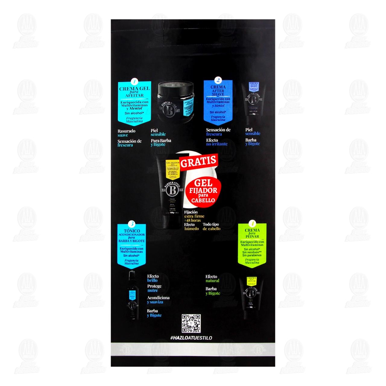 Pack Beard & Mustache Barber Style For Men. Contiene 5 piezas: 1 crema gel para afeitar, 1 crema after shave de 60 gr, 1 tónico acondicionador para barba y bigote de 60 ml, 1 crema para peinar de 60 gr y gratis 1 gel fijador para el cabello.