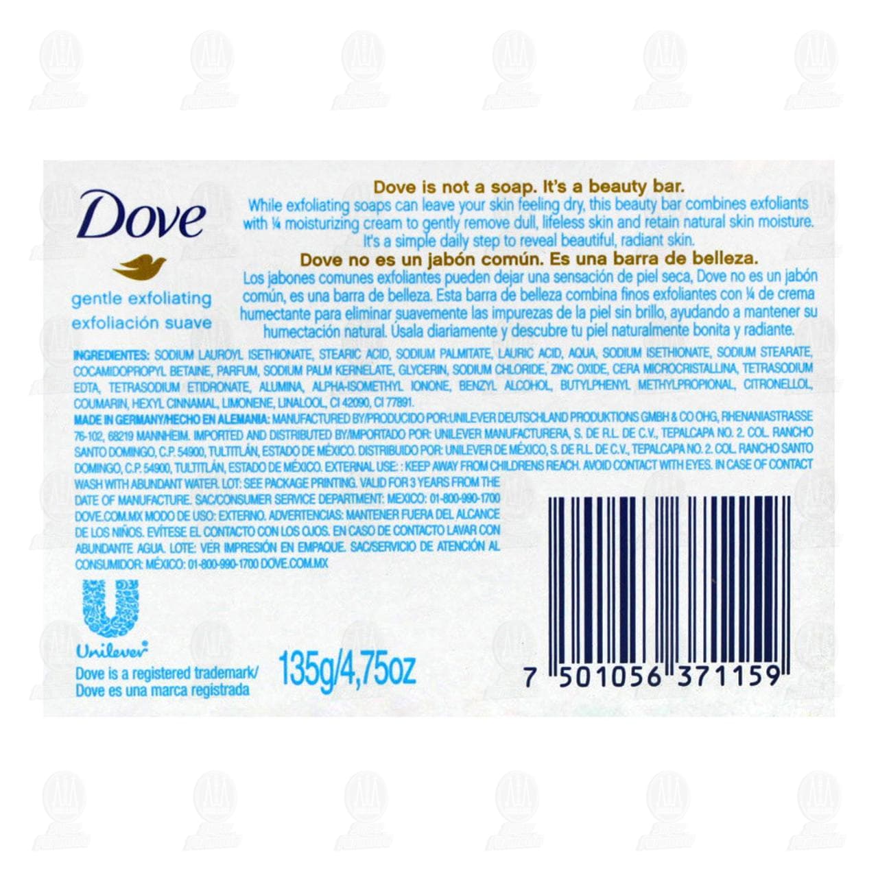 Jabón de tocador compuesto Dove Exfoliación Suave en barra, con 1/4 de crema humectante. Contiene 135 gramos.