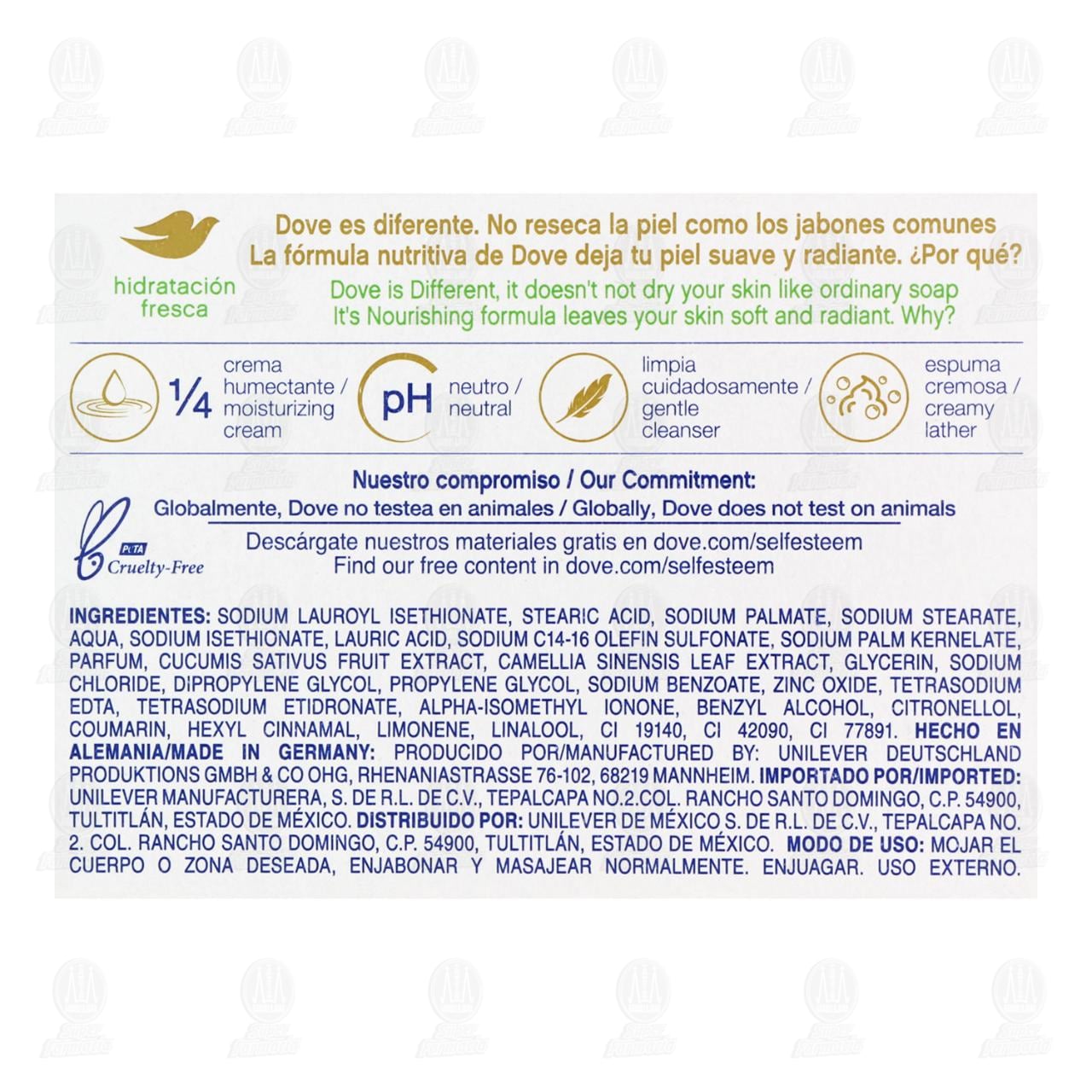 Jabón de Tocador Dove Go Fresh hidratación Fresca 1/4 de Crema Humectante. Contiene 135 gramos.