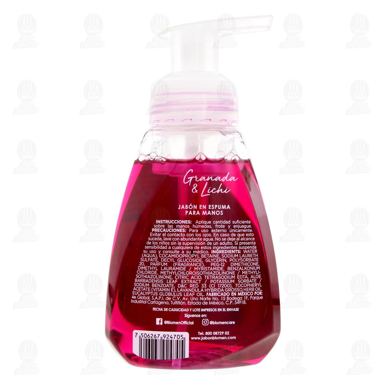 Jabón en Espuma Blumen Granada & Lichi para Manos, con Aceites Esenciales, Glicerina y Aloe. Envase con 332 mililitros.
