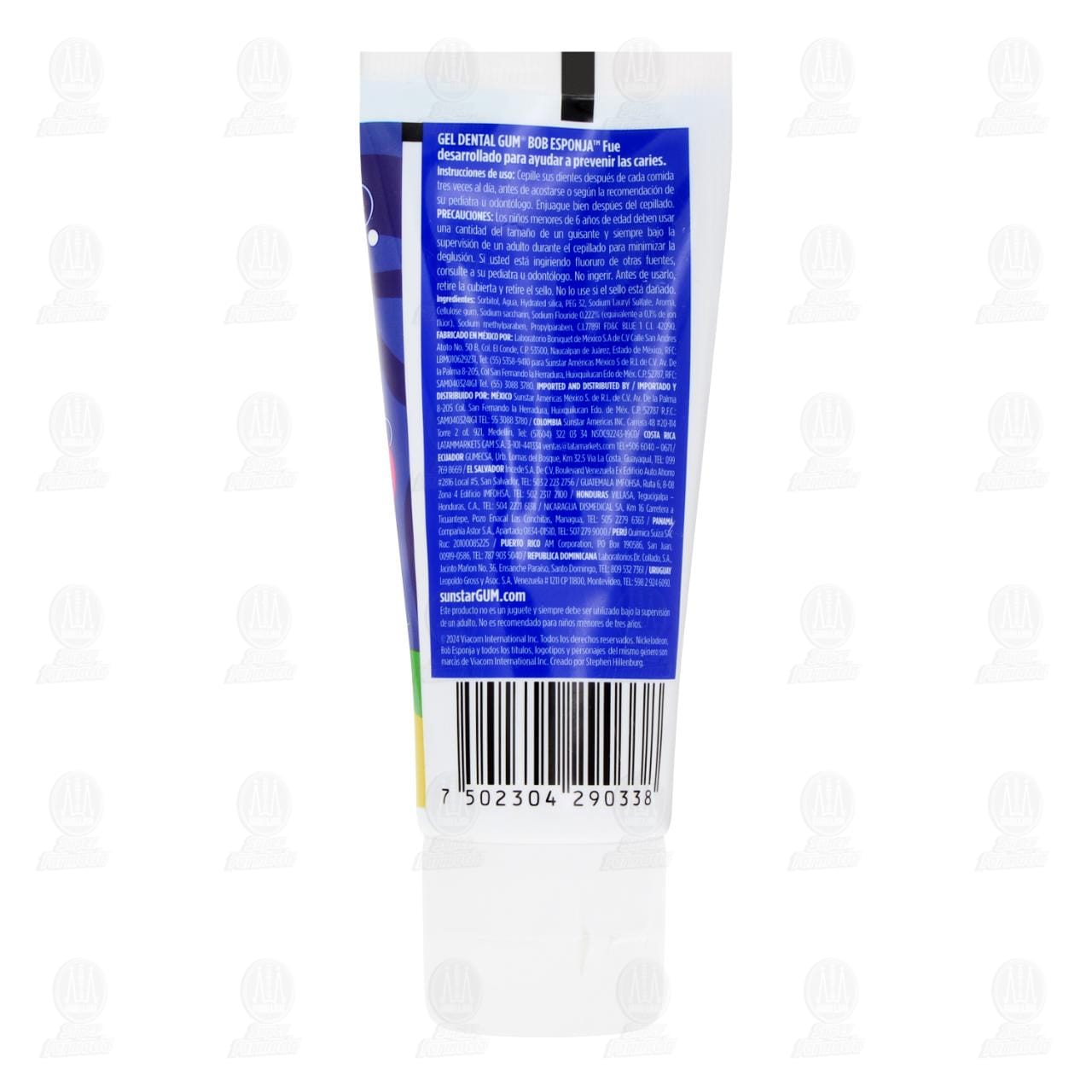 Gel Dental Infantil Gum con personaje Bob Esponja Nickelodeon y delicioso sabor bubble gum, Desarrollado para ayudar a prevenir las caries. Contiene 75 mililitros.
