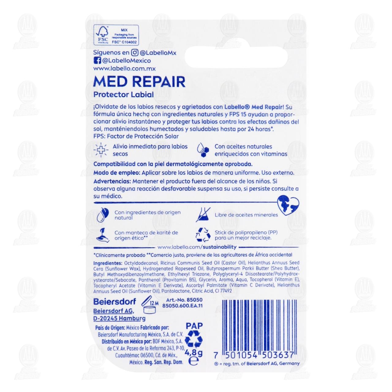 Protector Labial Labello Med Repair FPS 15 con ingredientes naturales que ayudan a proporcionar alivio instantáneo y proteger tus labios contra los efectos dañinos del sol, manteniendolos humectados hasta por 24 horas. Contiene 4.8 gramos.
