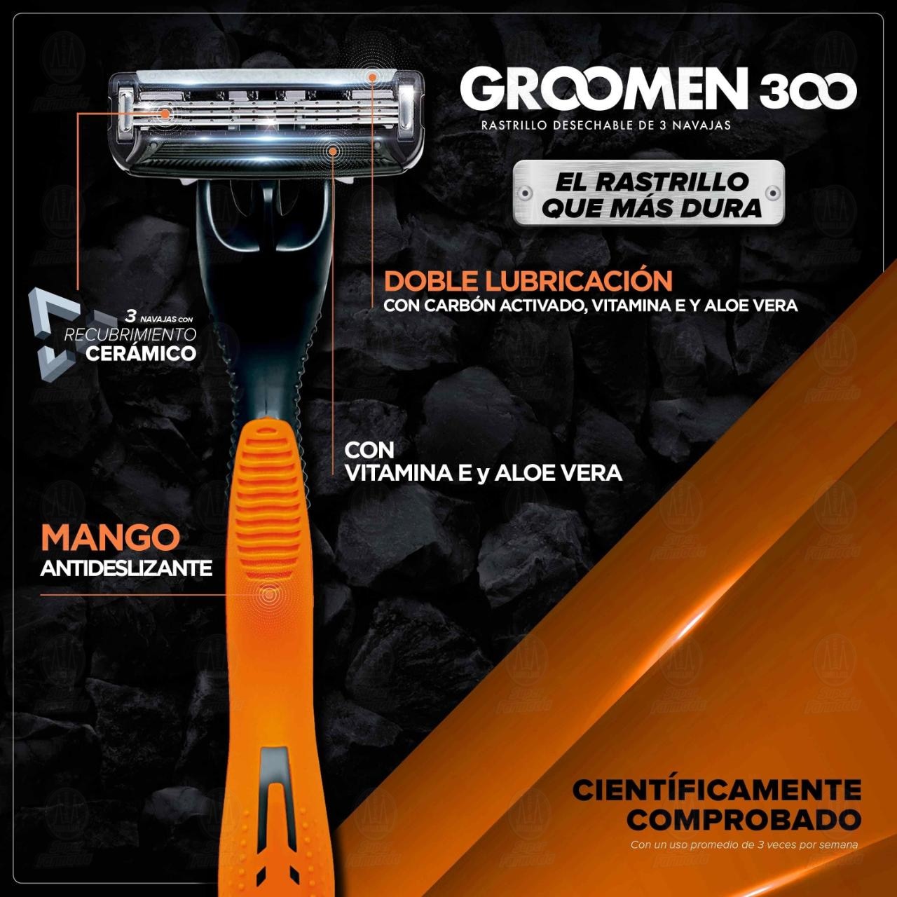 Rastrillo Desechable Groomen 300 de 3 Navajas con Recubrimiento Cerámico. Rastrillos con Lubricación Antes y después de las Navajas para Ayudar a Reducir la Irritación Durante la Afeitada. Contiene 2 Rastrillos.