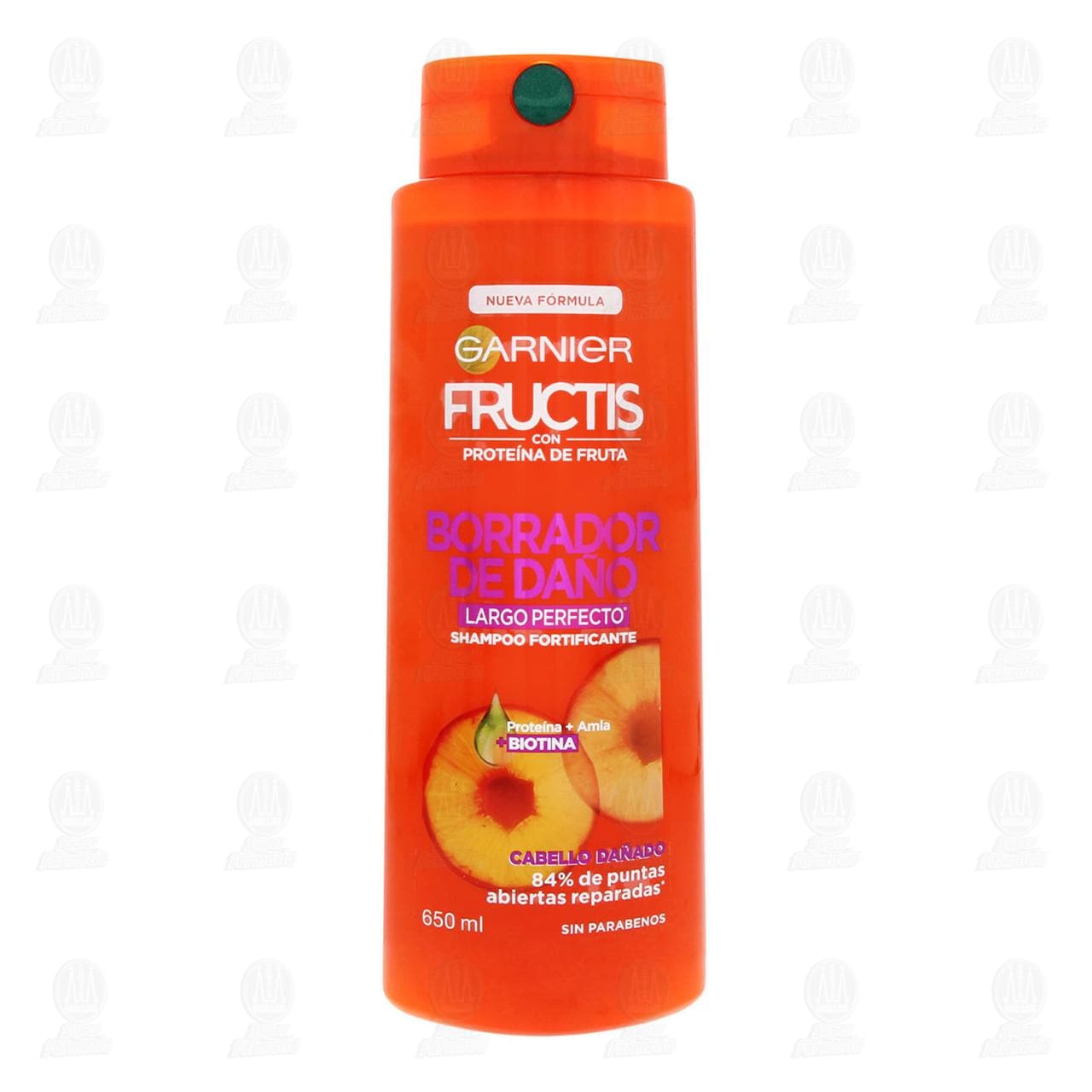 Shampoo Fructis de Garnier fortificante borrador de daño para un largo perfecto, con proteína más amla y biotina, especial para cabello dañado, 84% de puntas abiertas reparadas. Envase con 650 mililitros.