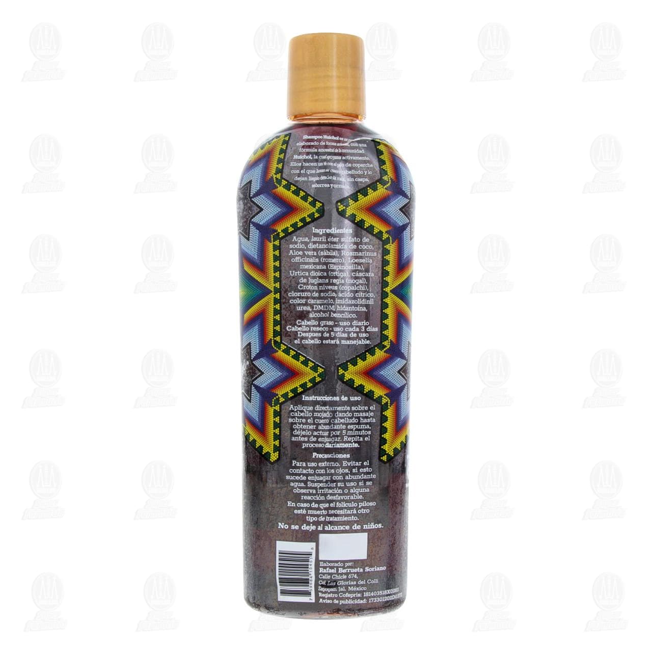 Shampoo Huichol, previene la caída del cabello, elaborado con una fórmula ancestral de concentrado de hierbas naturales que eliminan la grasa al instante. Envase con 400 mililitros.