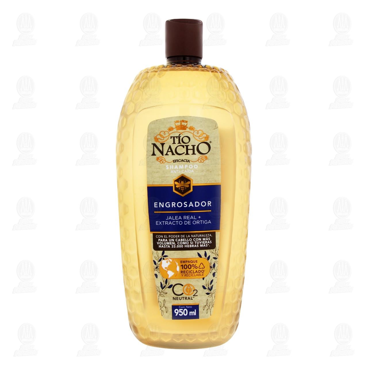 Shampoo Tío Nacho anti-caída Engrosador con jalea real y extracto de ortiga que ayudan a dar volumen y apariencia de más cabello. Contiene 950 mililitros.