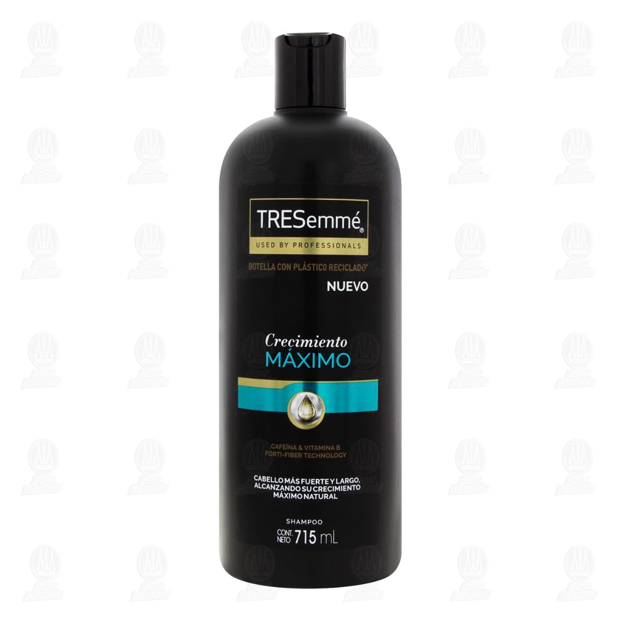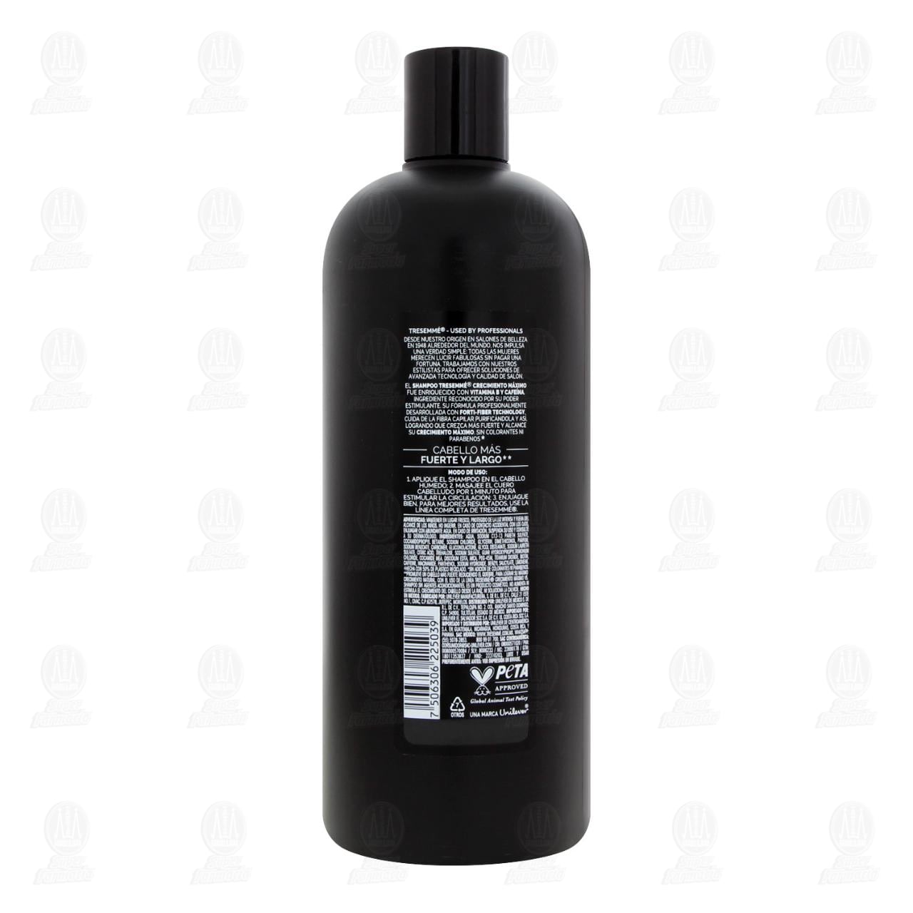 Shampoo Tresemmé Crecimiento Máximo Enriquecido con vitamina B y Cafeína. Fórmula Profesionalmente desarrollada con Forti-Fiber Technology. Cabello más fuerte y largo alcanzando su crecimiento Máximo natural. Envase con 715 mililitros.