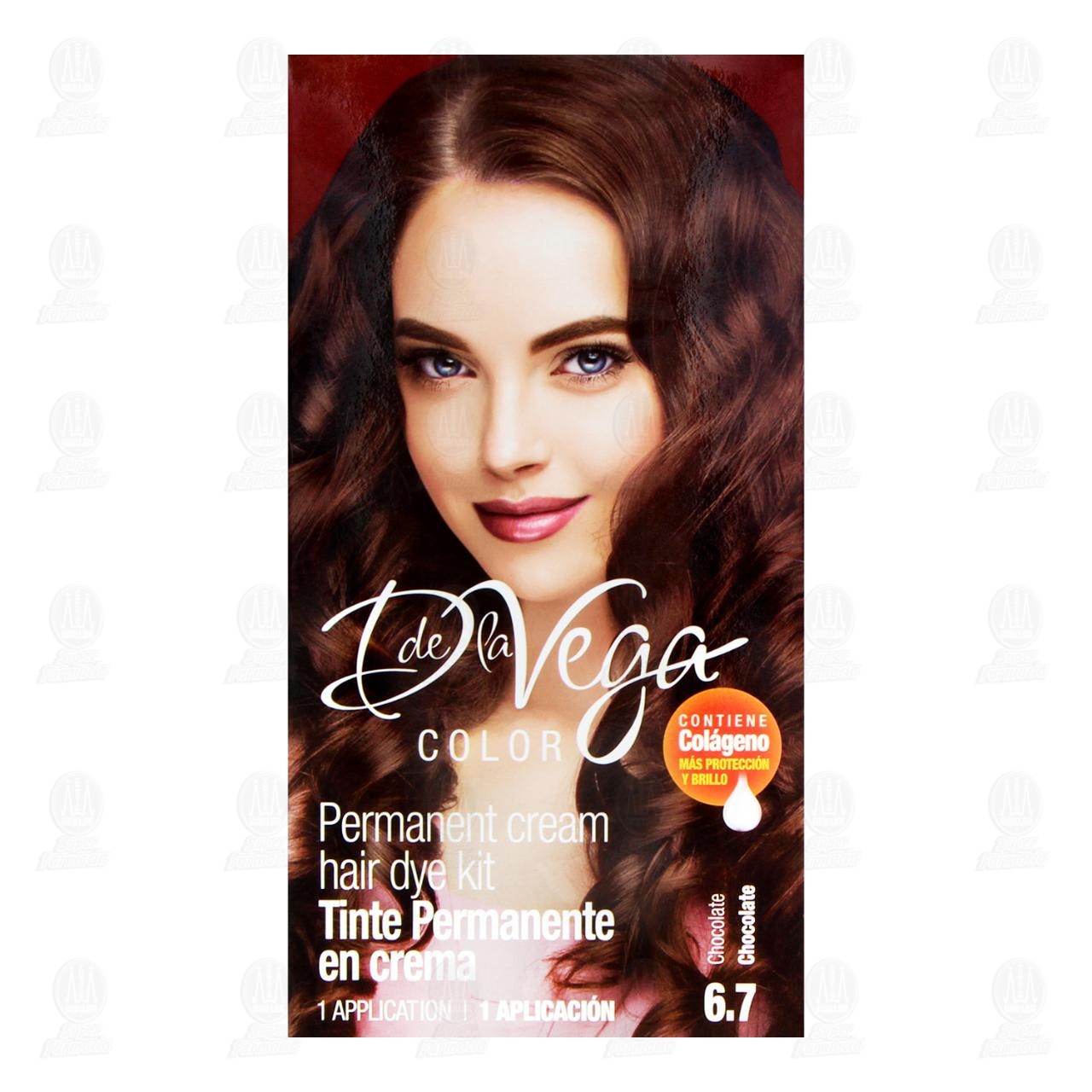 Tinte permanente en crema D de la Vega Color Chocolate 6.7, contiene colágeno más protección y brillo. Contiene 1 pieza.