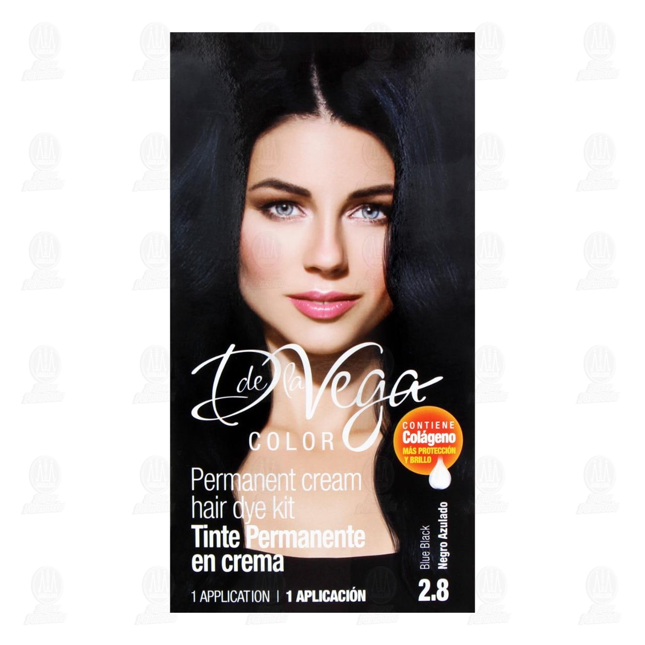 Tinte permanente en crema D de la Vega Color Negro Azulado 2.8, contiene colágeno más protección y brillo. Contiene 1 pieza.